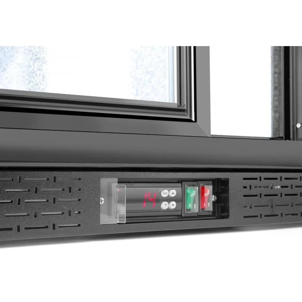 Gepoedercoate zwarte stalen behuizing. Deze uitvoering is vervaardigd uit aluminium met reliëf. Zelfsluitende deuren met dubbellaags glas en een kunststof frame. Voorpaneel van gehard glas. Slot met een sleutel. Statische koeling ondersteund met een ventilator. Automatisch ontdooien. Compressor bevindt zich onder de kamer. Temperatuurbereik: 2-10 °C. Kamer voorzien van LED-verlichting. Elektronisch bedieningspaneel met een digitaal temperatuurdisplay. 4 verstelbare antislipvoeten. Klimaatklasse: 4.