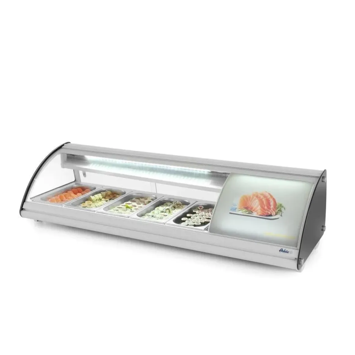Het Arktic Sushi-display 5x GN 1/3 geeft toegang tot de containers via de schuifdeuren aan de achterkant maar ook via de gebogen glazen afdekking aan de voorkant die opgetild kan worden.