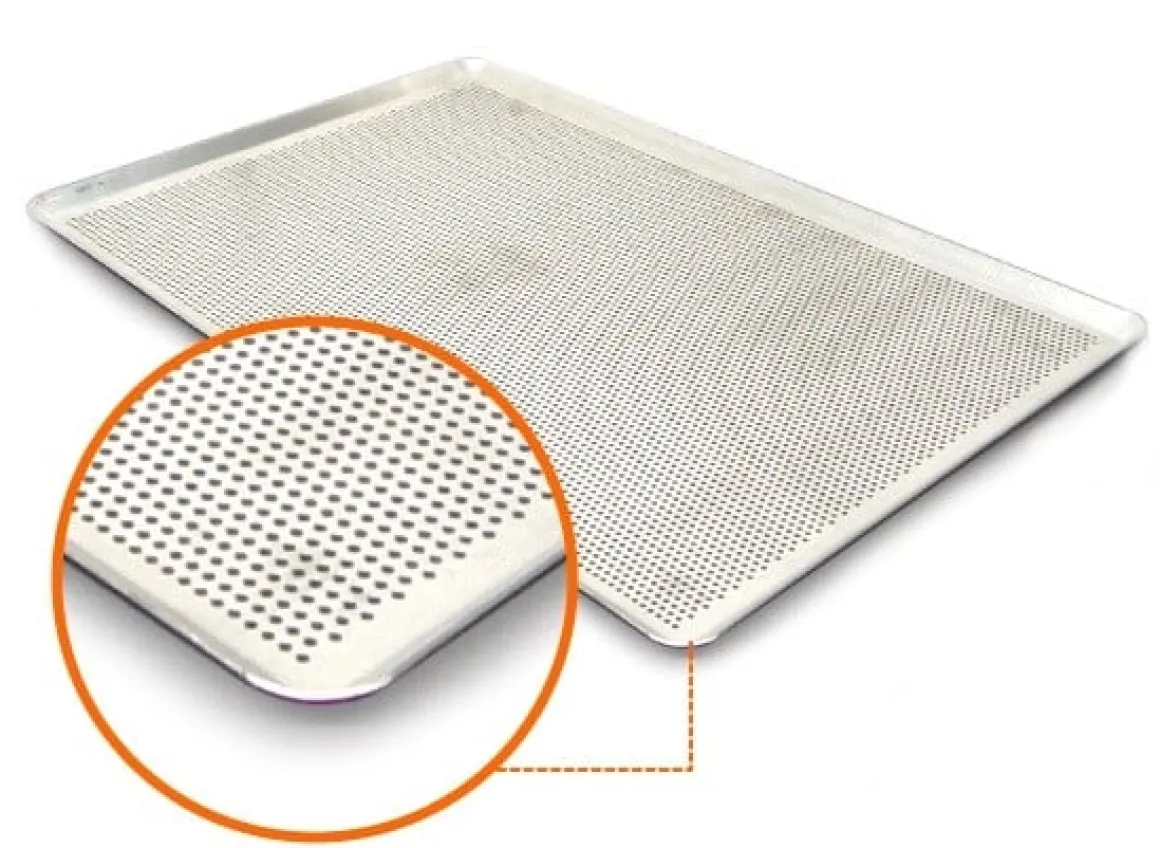 Geperforeerde bakplaat van lichtgewicht aluminium. Deze bakplaat beschikt over 4 gestanste randen/hoeken 45°. Een geperforeerde bakplaat wordt meestal gebruikt voor producten waarbij een betere warmtecirculatie in de oven belangrijk is.