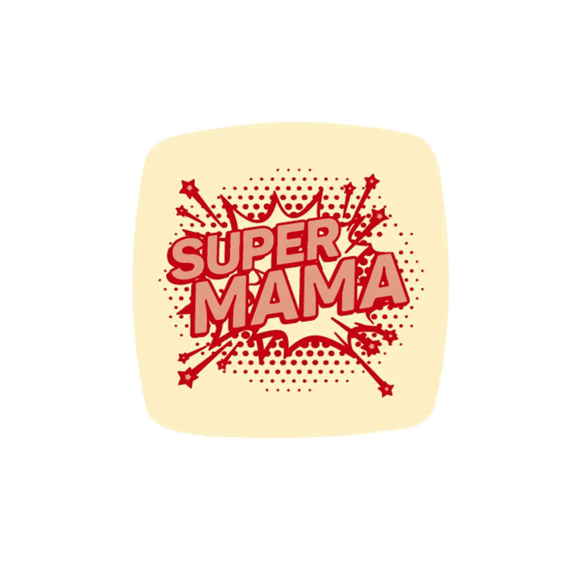Super Mama! Zet alle mama’s maar in het zonnetje en nietalleen met Moederdag. Deze chocoladedecoratie laat zien hoe goed alle mama’szijn. De decoratie heeft een vierkante vorm met daarop “Super Mama” gedrukt.Je kunt de decoratie gebruiken in combinatie met andere decoraties of alseenvoud. Gebruik de chocoladedecoratie om taarten, petitfourtjes, sloffen,bonbon en andere lekkernijen helemaal af te maken.