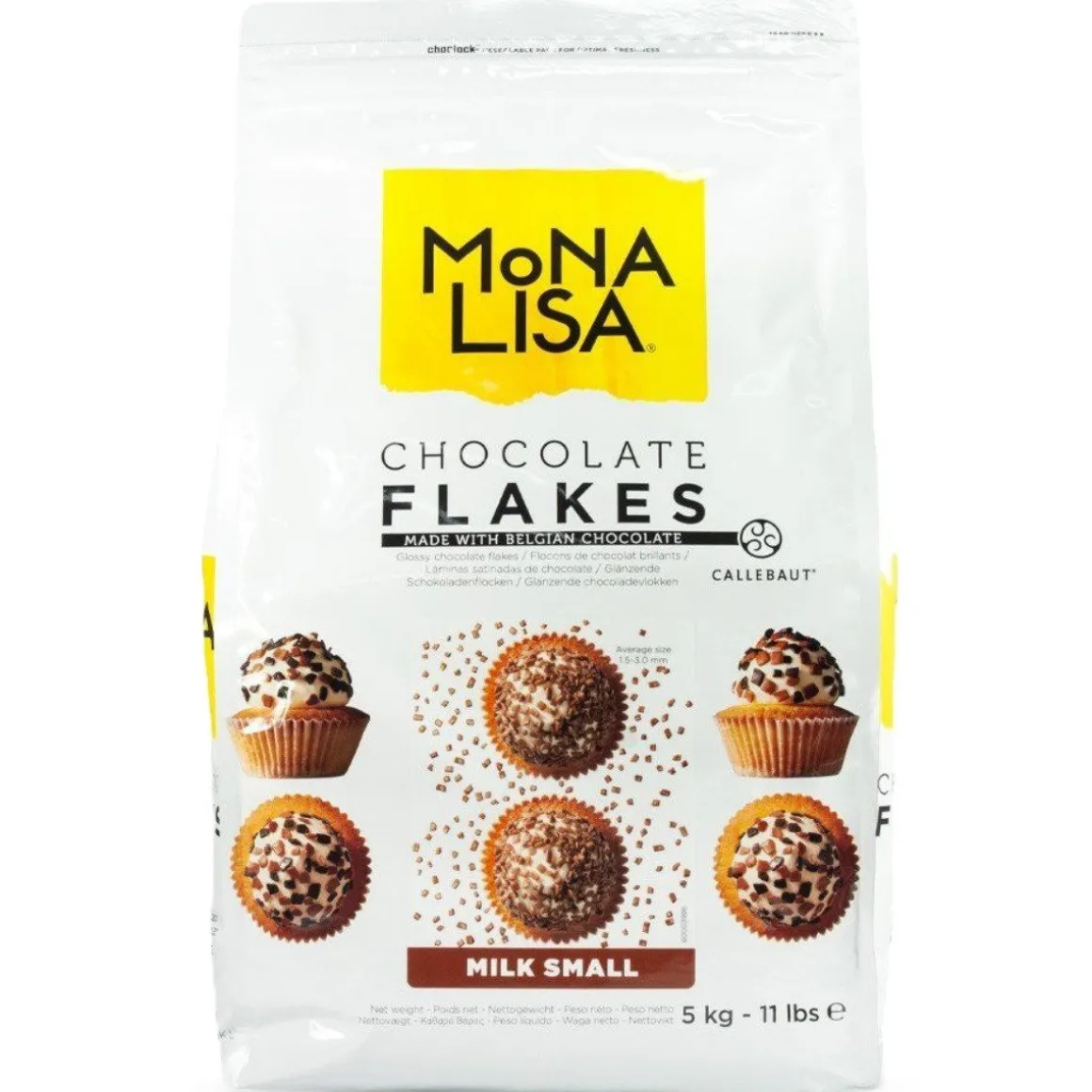 De Callebaut Chocoladevlokken Klein Melk 5kg zijn kant-en-klare strooisels gemaakt van lekkere melkchocolade. Deze chocoladevlokken zijn perfect voor het decoreren van allerlei verschillende baksels. Leuk om bijvoorbeeld taarten, cupcakes of gebakjes mee te versieren. Ook prachtig om een finishing touch te geven aan bonbons. De chocoladevlokken komen in een verpakking van 5 kilogram.