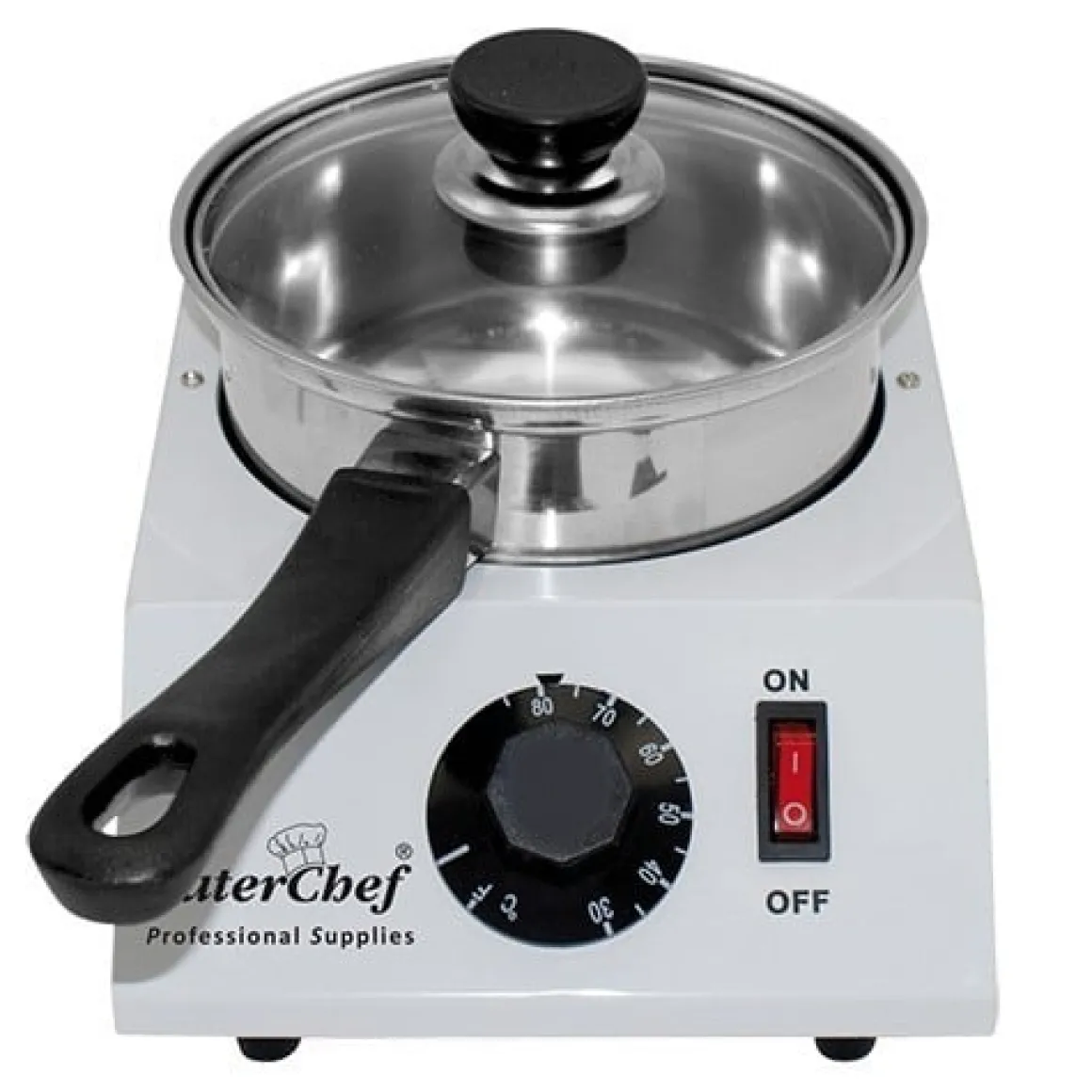 Warmer met een instelbare temperatuur van 30 tot 80°C en daardoor uitermate geschikt voor het smelten en/of verwarmen van chocolade of sauzen