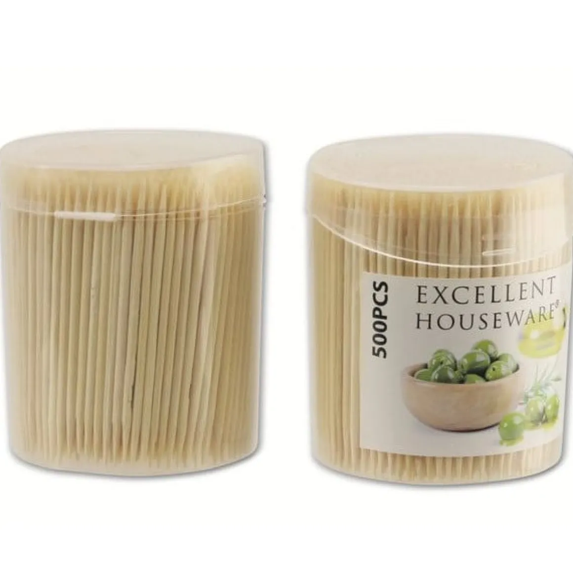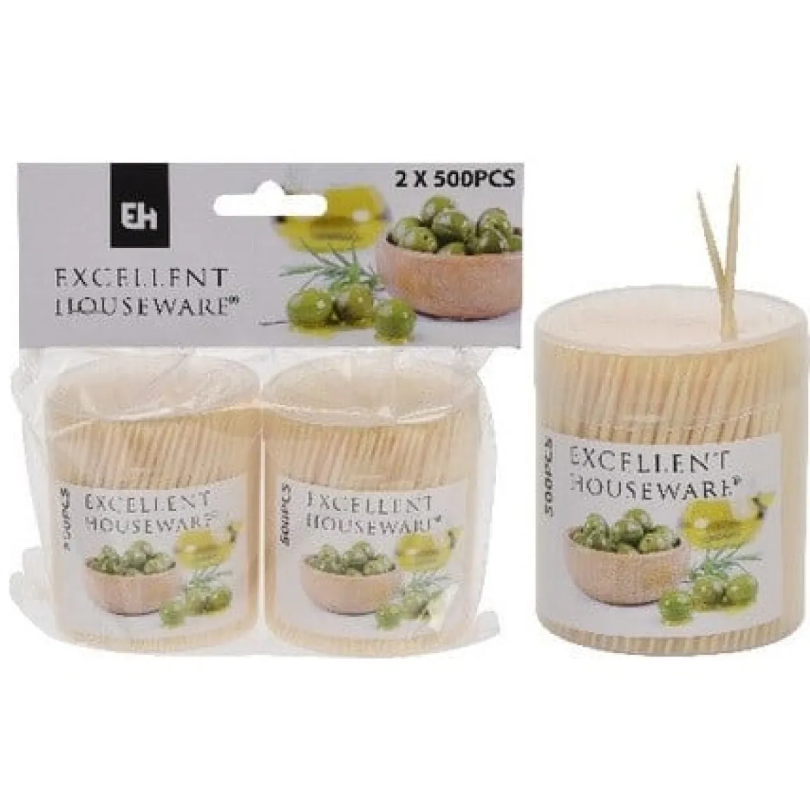 Houten cocktailprikkers (of tandenstokers), verpakt in 2 plastic kokers van 500 stuks.