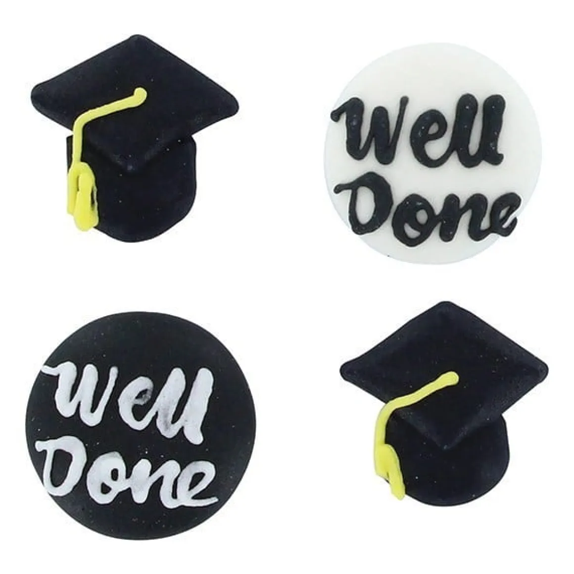 Een diploma halen en of slagen voor een belangrijk examen is natuurlijk een feestje waard. Bij feestjes horen natuurlijk ook lekkere dingen zoals taart en cupcakes. Met deze leuke suikerdecoratie decoreer je deze lekkernijen in een handomdraai en kan het feestje beginnen. Deze suikerdecoraties bevatten traditionele baretten en zwart en witte rondjes met well done erop.
