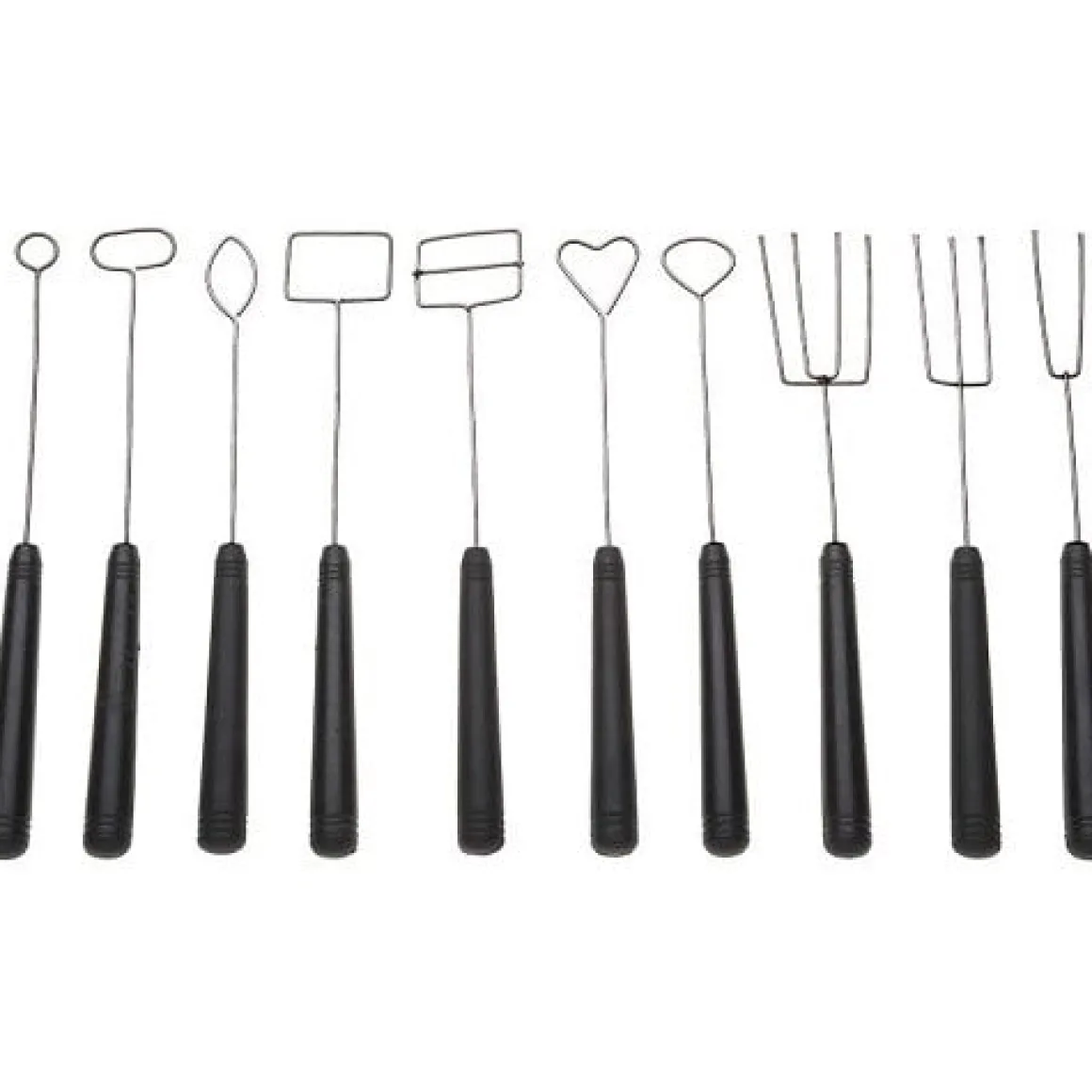 Deze doorhaalvorkjes zijn perfect om bonbons mee te maken. Je legt de bonbon op de vork en laat hem in de verwarmde chocola zakken. Deze set heeft maar liefst 10 verschillende vorkjes, te weten: 2-tands, 3-tands, 4-tands, rondje, ovaal (3 verschillende), rechthoek (2 verschillende) en een hartje.