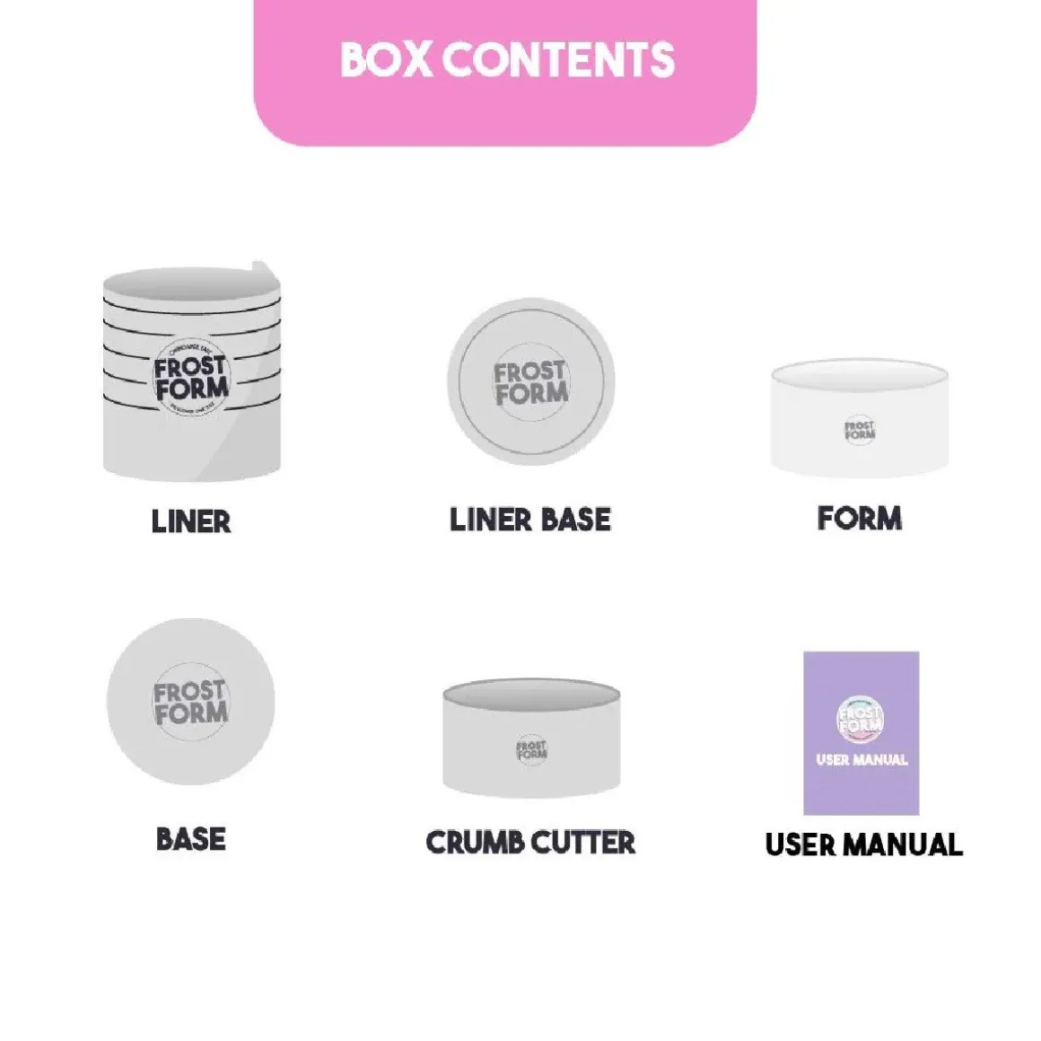 - Inhoud: liner, bodem liner (liner base), vorm (form), bodem (base), uitsteker (crumb cutter), handleiding.