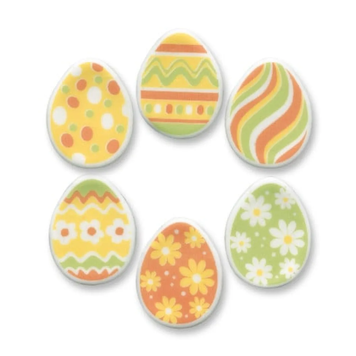 Deze leuke paaseieren schildjes zijn gemaakt van fondant en gekleurd in mooie kleuren. De eieren hebben 6 verschillende designs met de kleuren, groen, geel, oranje en wit. Perfect voor het decoreren van lekkernijen tijden de paasdagen.