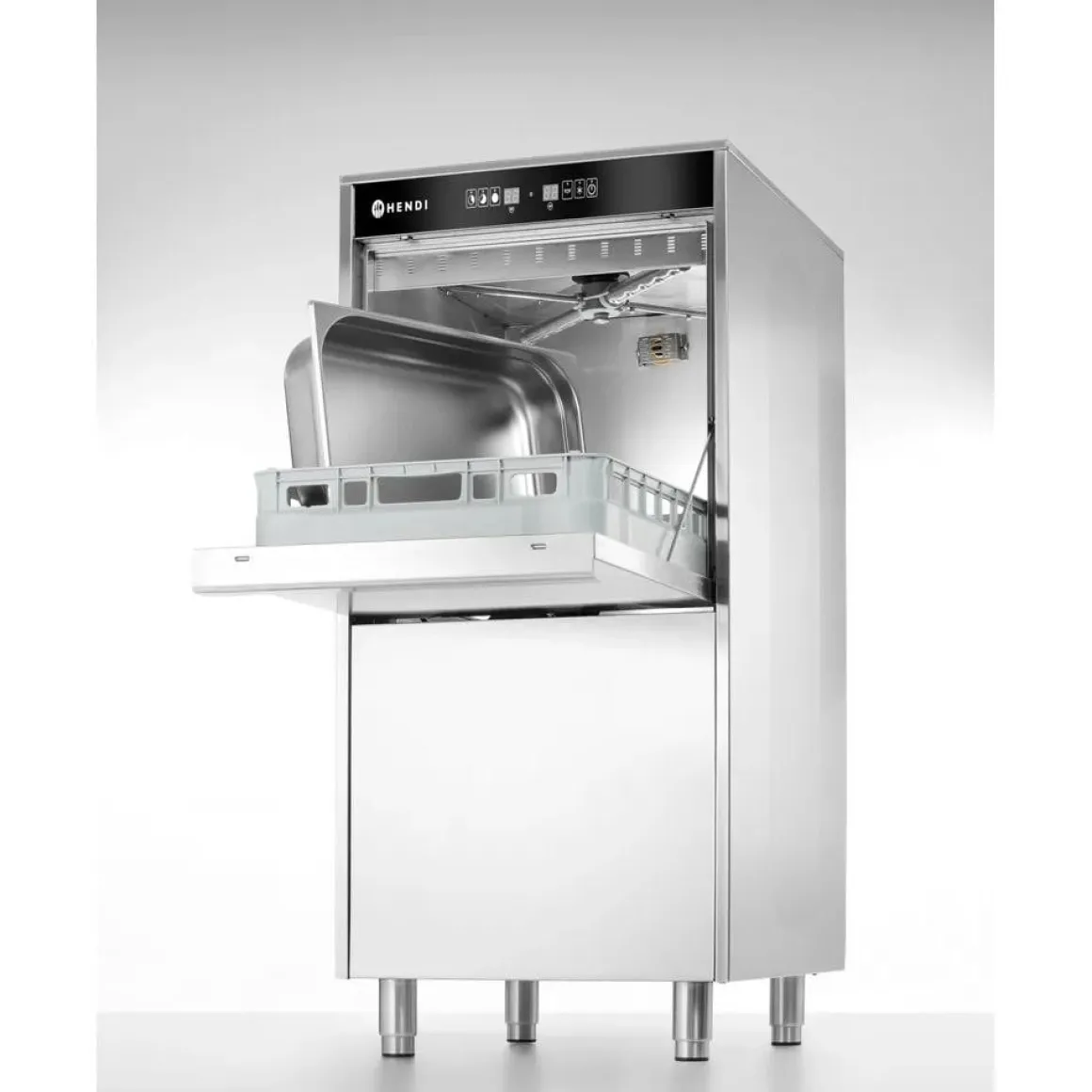 – Wasmiddeldispenser. – Dispenser voor glansspoelmiddel. – Elektronische thermometer in boiler. – Elektronische thermometer in bassin. – 1,2 kW waspomp. – Afvoerpomp. – Bordenkorf 500x600x(H)105 mm. – Universele korf 500x600x(H)105 mm. – Bestekmand 110x110x(H)130 mm.