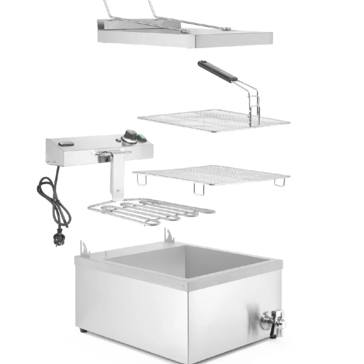 De Hendi Donut Friteuse is perfect voor het frituren van donuts, maar ook voor frituren van beignets, oliebollen en ander deeg. Je kunt deze friteuse intensief gebruiken en er grote hoeveelheden in bereiden. De friteuse wordt geleverd met twee bakroosters, een verwarmingsrooster en een deksel. De deksel kan tevens als lekbak gebruikt worden. Het verwarmingselement schakelt uit bij het verwijderen of bij oververhitting ervan, aan het indicatielampje kan afgelezen worden of het element werkt. Het instellen van de temperatuur kan van 50 °C tot maximaal 190 °C.