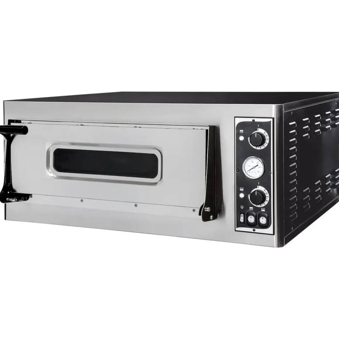 Voorzijde van roestvast staal, behuizing van staal, met steenwol geïsoleerd. Analoge bediening met afzonderlijke instelling per hitte-element, twee elementen per ovenkamer. Elke ovenkamer is voorzien van refractiestenen, een thermometer en interne verlichting. Modellen met 2 ovenkamers hebben voor elke kamer een afzonderlijk volledig bedieningspaneel. Temperatuurbereik: 50°C tot en met 500°C.