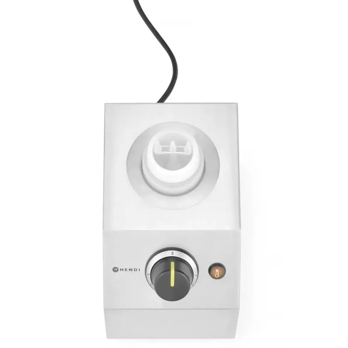De HENDI Sauswarmer is perfect om chocoladesaus en andere sauzen op de juiste temperatuur te houden om het gemakkelijk over ijs, crêpes en andere desserts te doseren. Plaats de fles in de verwarmer en de inhoud wordt opgewarmd tot de ingestelde temperatuur. Verander de temperatuur om de chocoladesaus dunner of dikker te maken.