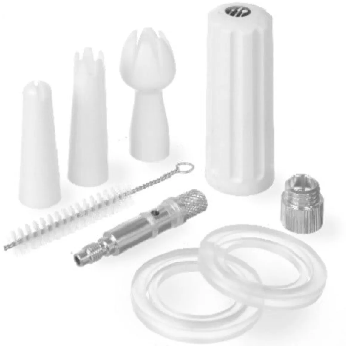Maak kennis met dit fraaie slagroomapparaat uit de Kitchen Line van het merk Hendi. Het apparaat bestaat uit een aluminium kop, een witte aluminium fles en een patroonhouder. Verder beschikt de set over 3 polyproplyleen spuitmondjes en een schoonmaakborsteltje. In dit slagroomapparaat horen N2O slagroompatronen. Deze zijn niet inbegrepen maar zijn wel bij ons verkrijgbaar. Zoek hiervoor naar artikelnummer 250024 en artikelnummer: 588208.