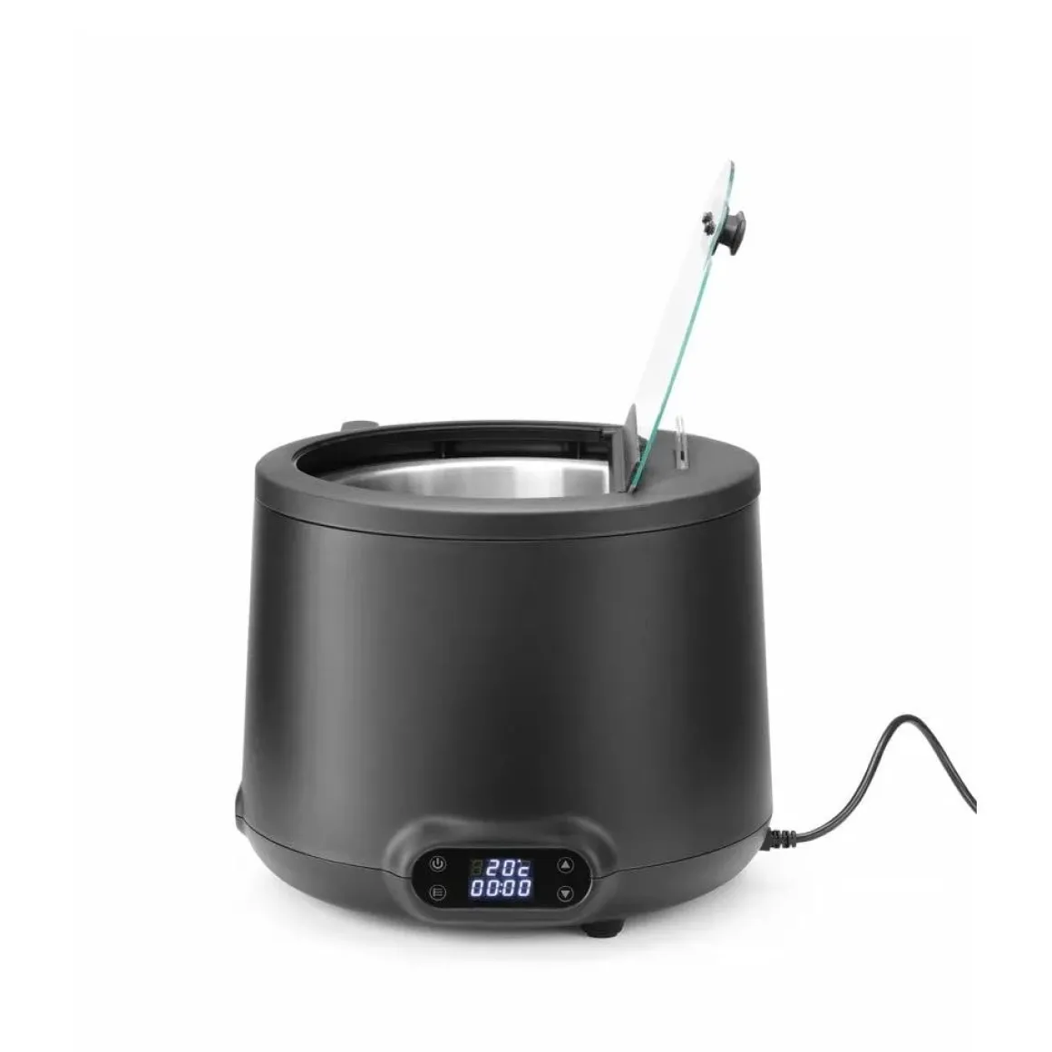 Stijlvol en functioneel ontwerp van de Nederlandse ontwerper Robert Bronwasser. Deze uitvoering is vervaardigd uit hittebestendig polypropyleen. Deze uitvoering is vervaardigd uit AISI 304 roestvast staal, eenvoudig te reinigen. Deze uitvoering is vervaardigd uit AISI 304 roestvast staal en geplaatst in het waterreservoir voor efficiënte warmteoverdracht. Deksel van gehard glas met geïsoleerde handgreep, lepeluitsparing en aluminium scharnier. Het ontwerp van het tweedelige deksel vermindert het warmteverlies bij het openen, terwijl optimale hygiënische omstandigheden behouden blijven. Geïntegreerde kaarthouder op het deksel voor naamkaarten. Digitaal bedieningspaneel met display dat de werktijd, ingestelde temperatuur en werkelijke temperatuur weer te geven. De laatste temperatuurinstelling wordt opgeslagen in het geheugen en wordt telkens wanneer de stroom wordt ingeschakeld geselecteerd. De temperatuur kan worden ingesteld van 35 tot 85 ̊C in stappen van 1 ̊. Het waterreservoir is voorzien van een max. Vullijn, die ≈1,5L aangeeft. Niet bedoeld om te koken, alleen om warm te houden.