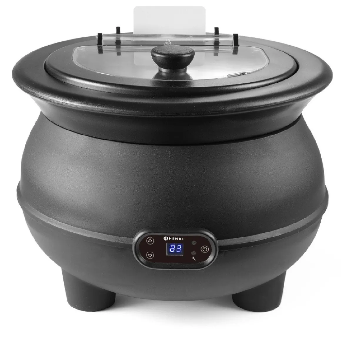 De Hendi Soepketel met Digitale Display is een elektrische soepketel, die onder andere perfect tijdens buffetten kan worden gebruikt. De pan heeft een zwarte buitenkant met aan de onderkant rubberen anti-slip pootjes. Er zit een display aan de voorkant die de ingestelde en huidige temperatuur weergeeft. De thermostaat kan ingesteld worden van 65° tot 95°C. Bovenop de soepketel zit een transparante deksel van polycarbonaat met een geïsoleerde handgreep, een lepeluitsparing en een naamkaartjeshouder. Aan de binnenkant kan een aluminium waterpan gevuld worden, voor een efficiënte warmt overdracht.