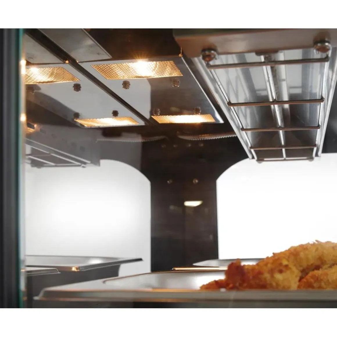 Behuizing van roestvast staal, zijkanten van gehard glas, gebogen glazen deuren en achterwand van spiegel. Toegang via twee gebogen glazen deuren aan de voorzijde. Op de planken passen tot 4x GN 1/2-containers (GN bakken zijn niet inbegrepen). Uitgerust met twee kwarts verwarmingselementen en een elektrische verwarmingsplaat aan de onderkant. Met mechanische temperatuurregelaar. Uitgerust met verlichting aan de bovenkant. Temperatuurbereik: 30 tot 90°C.