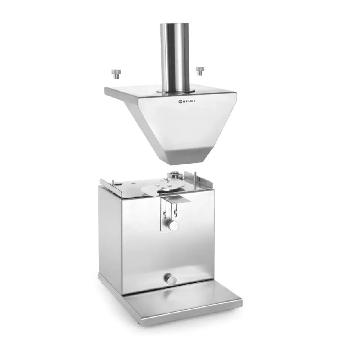 Elektrische worstensnijder met dubbel mes en regelbare snijdikte. Extra lange invoer schacht voor allerlei soorten worst. Maximum diameter van 48 mm.