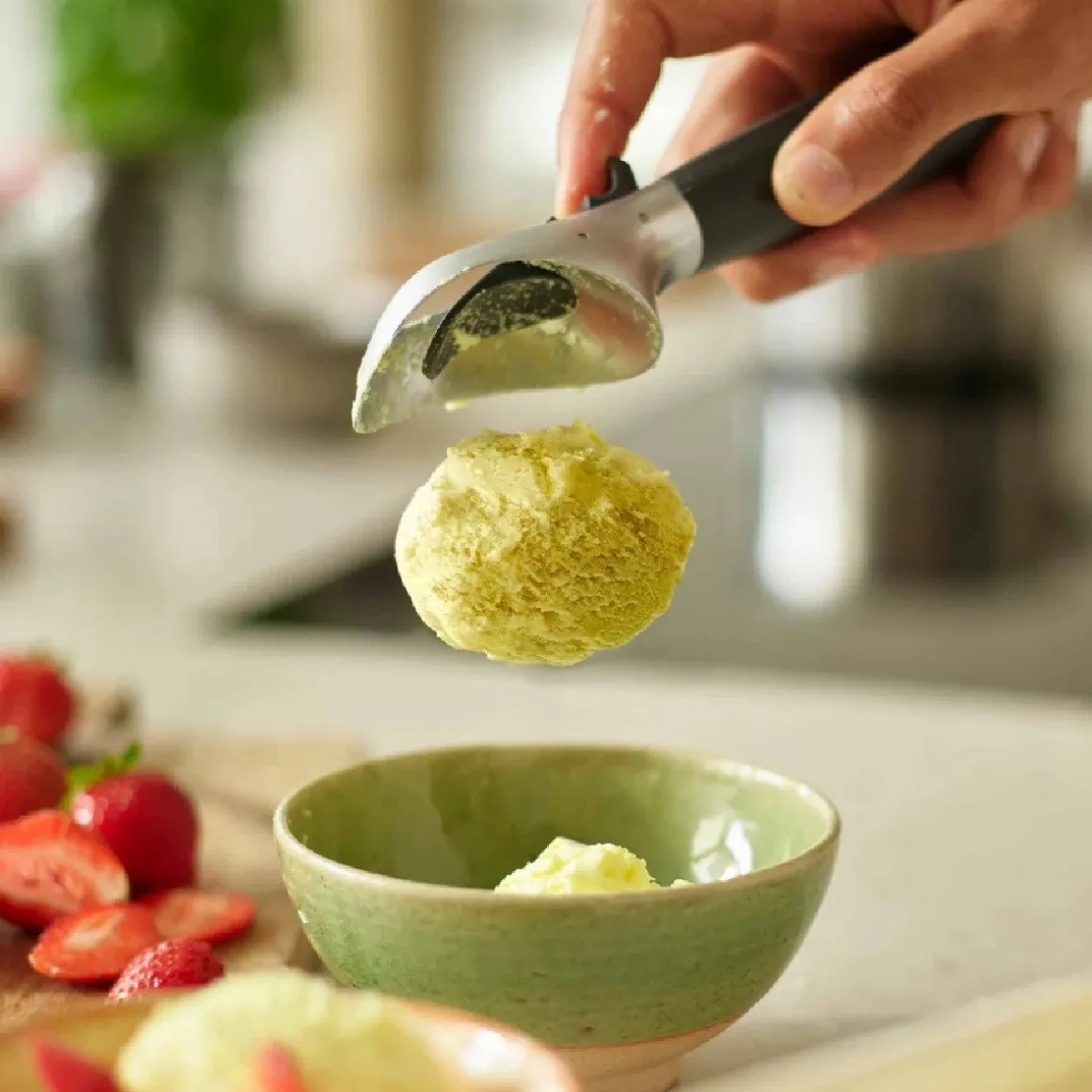 De Joseph Joseph IJsschep Ø5,3cm is een praktische ijsschep met een mooie vormgeving. De schep heeft een stevige materiaal en komt met gemak door hard room- of sorbetijs heen. Door het mechanisme aan de achterkant, gaat het ijs eenvoudig uit de schep. Daarnaast heeft het zwarte mechanisme nog een andere functie. Wanneer je de ijslepel neerlegd, raakt deze namelijk niet het oppervlak. Dit zorgt voor minder geknoei en een betere hygiëne.