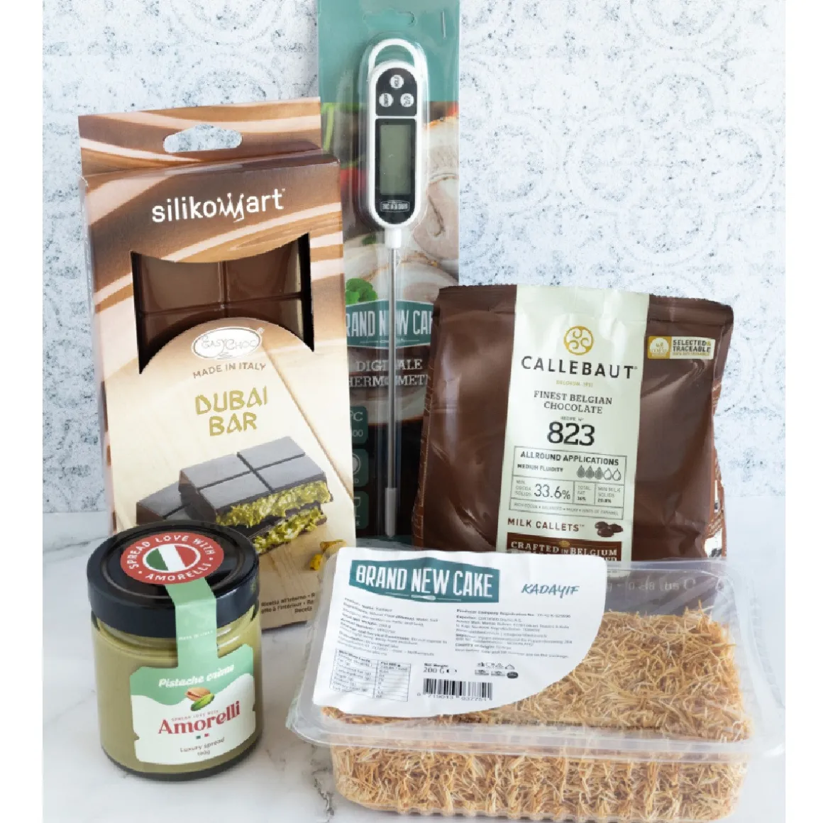 Creëer zelf luxe chocolade repen met een romige, krokante vulling met behulp van het Maak je eigen Dubai Reep-pakket. Deze combinatie van romige melkchocolade, rijke pistachecrème en knapperige kadayif zorgt voor een verrukkelijke smaak én textuurbeleving.