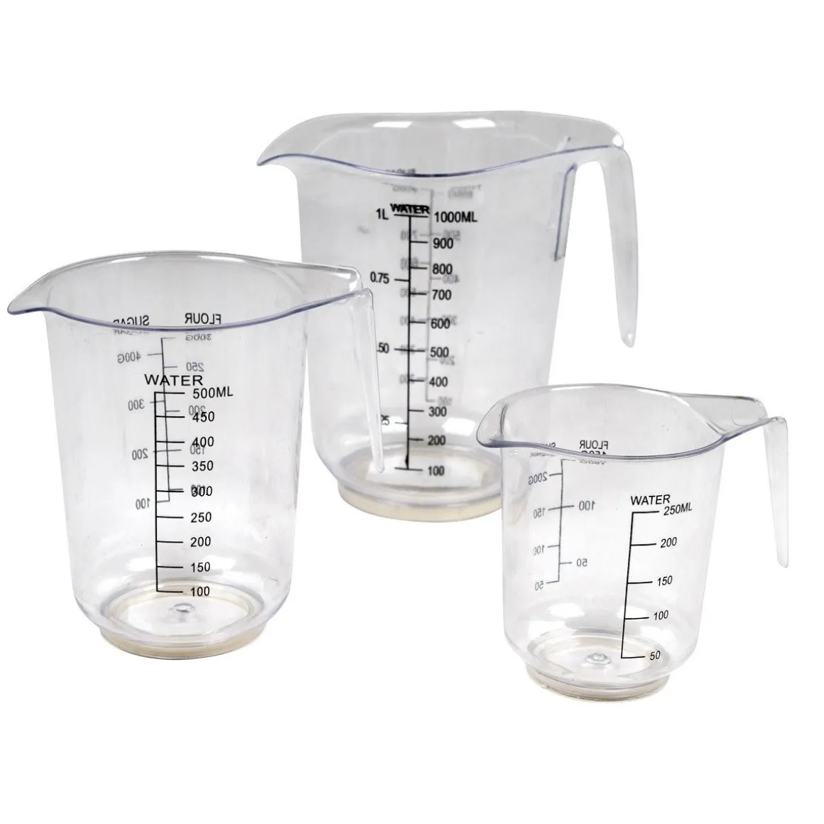 Set van drie stevige maatbekers (ook wel litermaten genoemd). Het handige aan deze maatbeker is dat ze alledrie in elkaar passen, zo bespaar je veel ruimte.