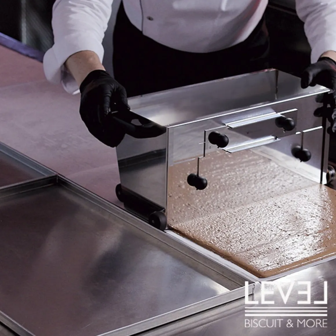 4. Trek het guillotinesysteem omhoog en laat de trekbak over de gekozen ondergrond lopen waarmee je een mooie, gelijkmatige laag beslag achterlaat. (bijvoorbeeld op een siliconen bakmat of bakpapier).