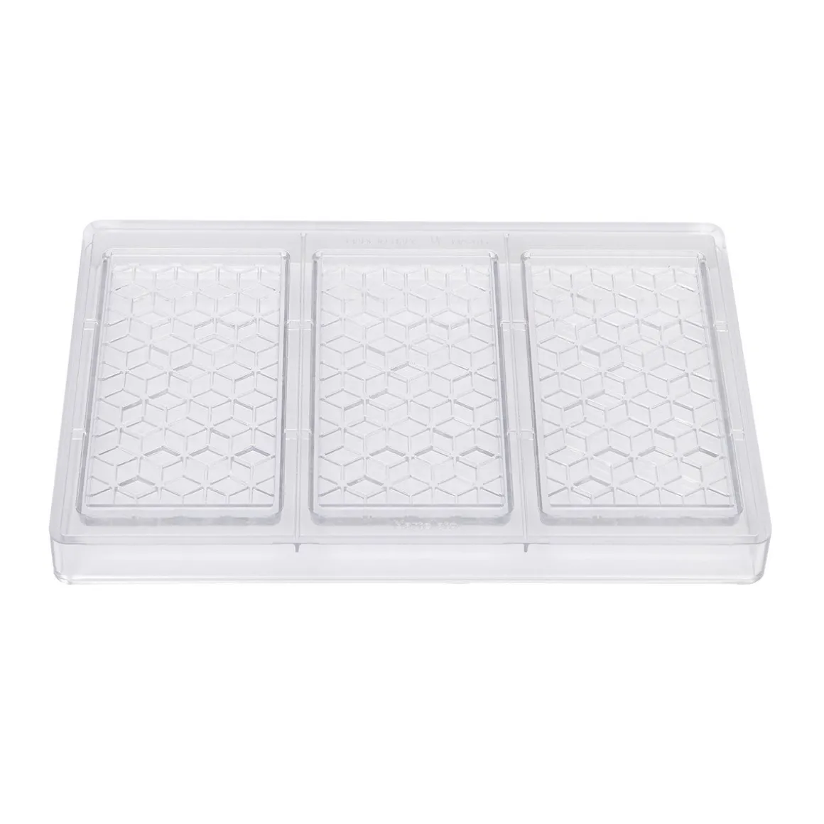 Chocolademal tablet Kube van Martellato. Er kunnen in totaal 3 tabletten gemaakt worden met deze vorm. De tabletten wegen ongeveer 100 gram per stuk. Afmeting van één tablet: 137 x 72 x 10 (h) mm. De vorm is gemaakt van een sterk polycarbonaat en heeft een afmeting van 275x175mm.