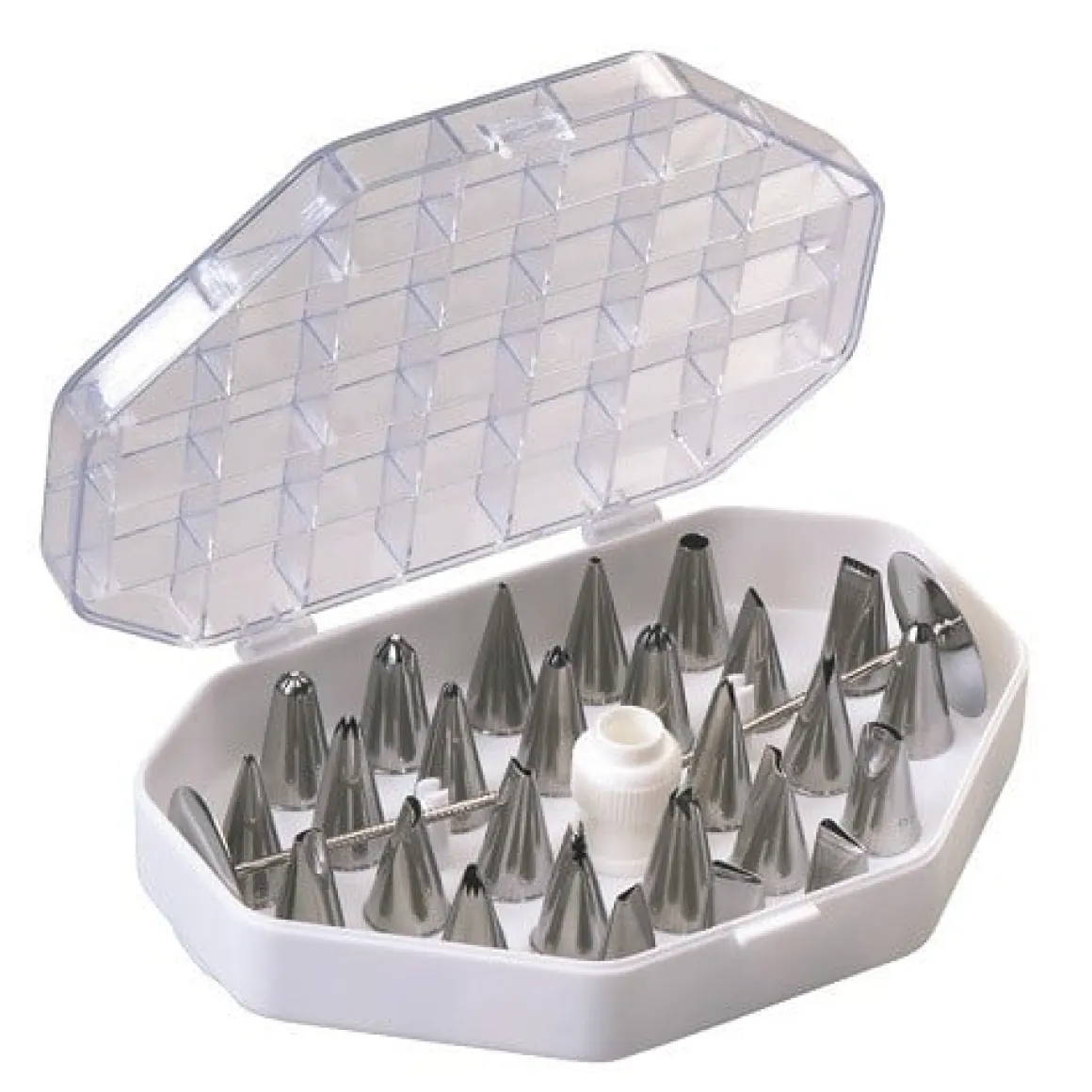 Deze spuitmondjes set maakt het opspuiten van je botercrème, royal icing of andere toppings een stuk makkelijker. Begin je net met het decoreren van taarten, cakes, cupcakes, koeken of andere creaties dan is deze set echt een aanrader. Met deze set heb je veel verschillende spuitmondjes van hoge kwaliteit in huis. De spuitmonden zijn makkelijk op te bergen in de kunststof opbergdoos.