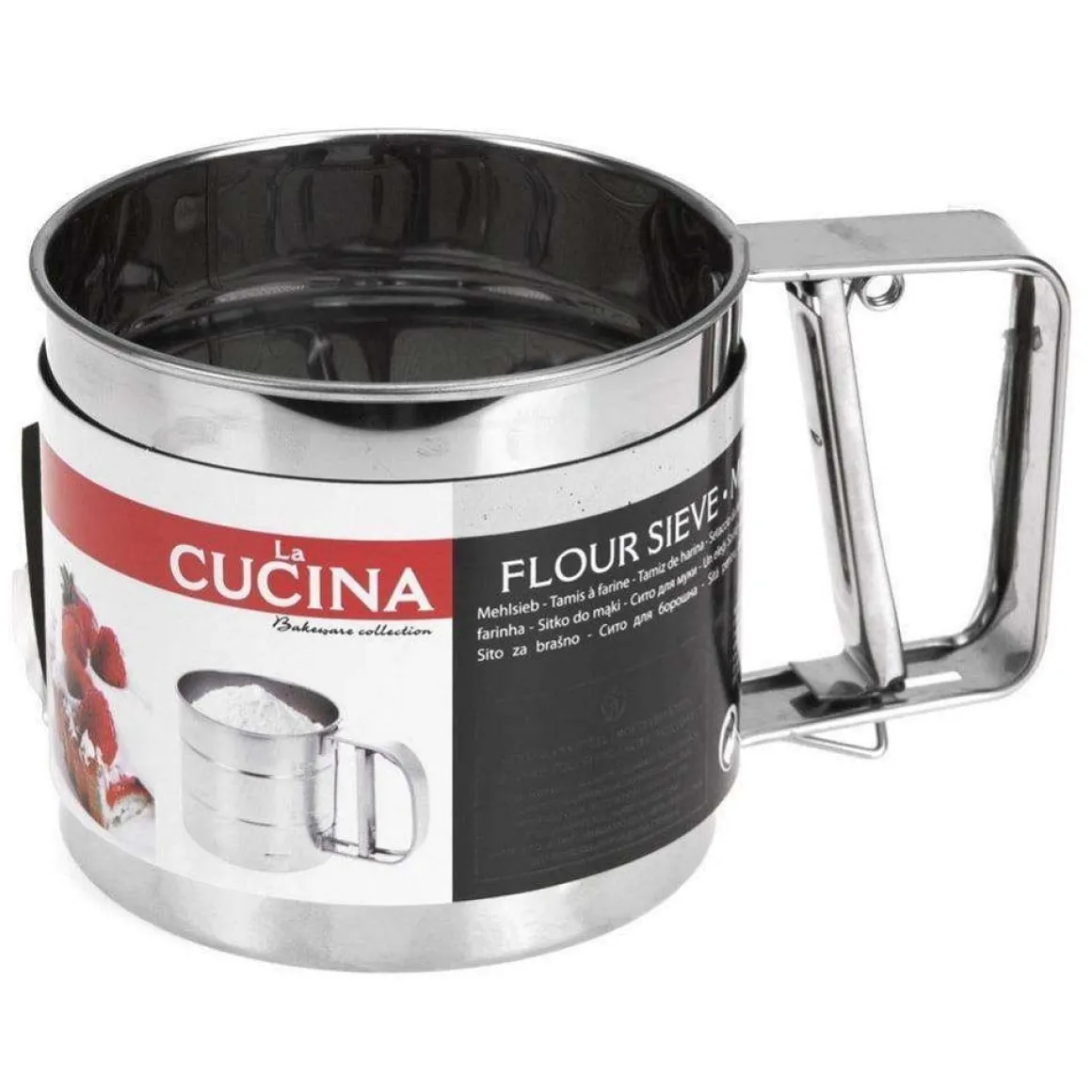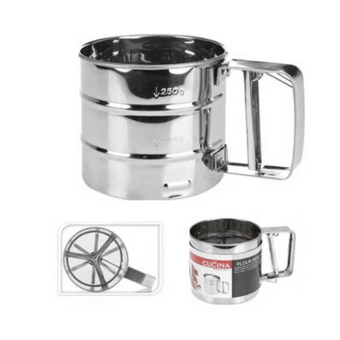Deze meelzeef (ook wel poedersuikerstrooier genoemd) is gemaakt van RVS. De maximale capaciteit is 250 gram. Deze zeef is handig in gebruik omdat het met één hand te bedienen is. De meelzeef is voorzien van een knijp-mechanisme in het handvat.