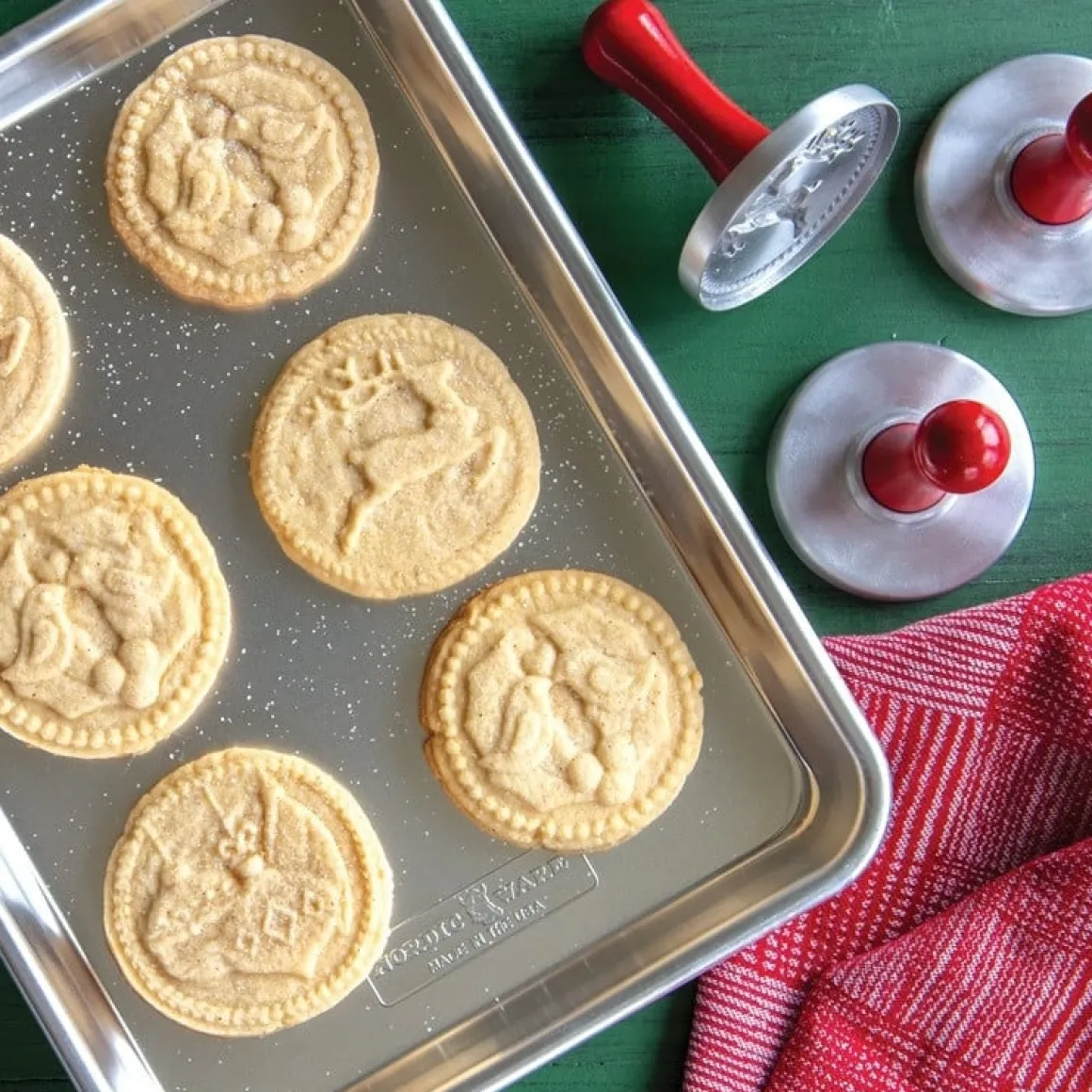 Een hulst takje, klassieke kerstversiering en een springendhert. Deze drie figuren kun je allemaal uitdrukken op je (koekjes)deeg met dezeNordic Ware Koekjesstempel Kerst. De stempels zijn gemaakt van gegotenaluminium met rode hardhouten handvatten. Daarnaast hebben de stempels eenprachtig opvallend randdetail, om ze te onderscheiden van andere koekjes. Verasje gasten tijdens de kerstdagen met fraaie koeken.
