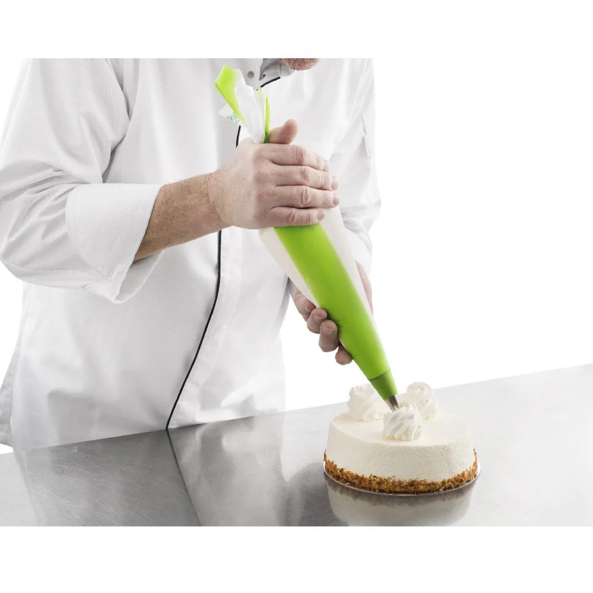 Het grootste formaat van de Marsteline Green serie. De Masterline serie is perfect voor het gebruik in een professionele keuken of bakkerij, door de speciale ‘soft touch’ grip in combinatie met de gekleurde punt. Tegenwoordig wordt het product niet meteen gebruikt wanneer het gemaakt wordt, maar dat is voor de spuitzak geen probleem. De spuitzak heeft een extra versterkte tussenlaag, hierdoor kun je het onder hoge druk gebruiken met krachtige handen.