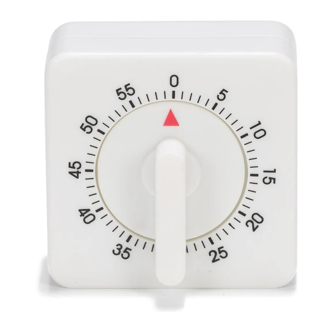 Gebruiksaanwijzing: Draai de wekker eerst door tot 55 min en daarna terugdraaien naar de gewenste tijd.