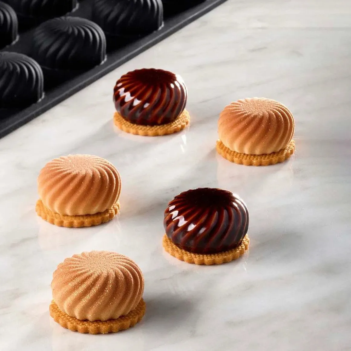 De holtes hebben een doorsnede van 4 centimeter en een hoogte van 2 centimeter. Hiermee creëer je prachtige Caleidon-vormpjes: een verfijnd, gegroefd bolvormig ontwerp. Gebruik de vorm voor het maken van moussegebakjes, bavarois of semifreddo. Ook uitstekend te gebruiken in de oven, bijvoorbeeld voor kleine cakejes.