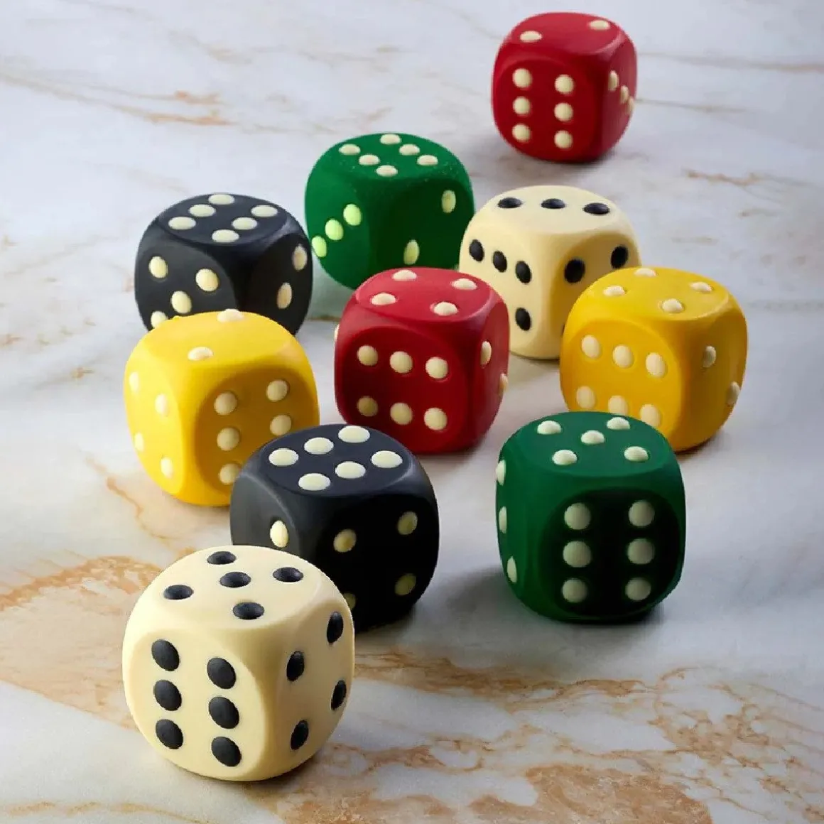 Maak bijvoorbeeld dobbelsteendesserts met een kern van mousse en een fluweelcoating of kleurrijke bonbons met een zachte vulling in deze siliconen vorm. De dobbelstenen zijn gewelidg bij onder meer spelletjesfeestjes of kinderevenementen, maar ook geschikt als originele toevoeging op dessertborden.