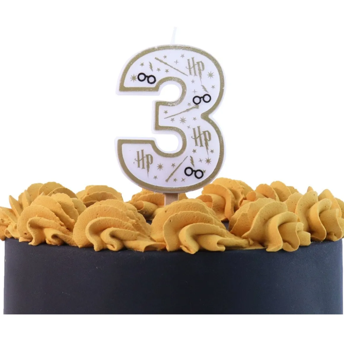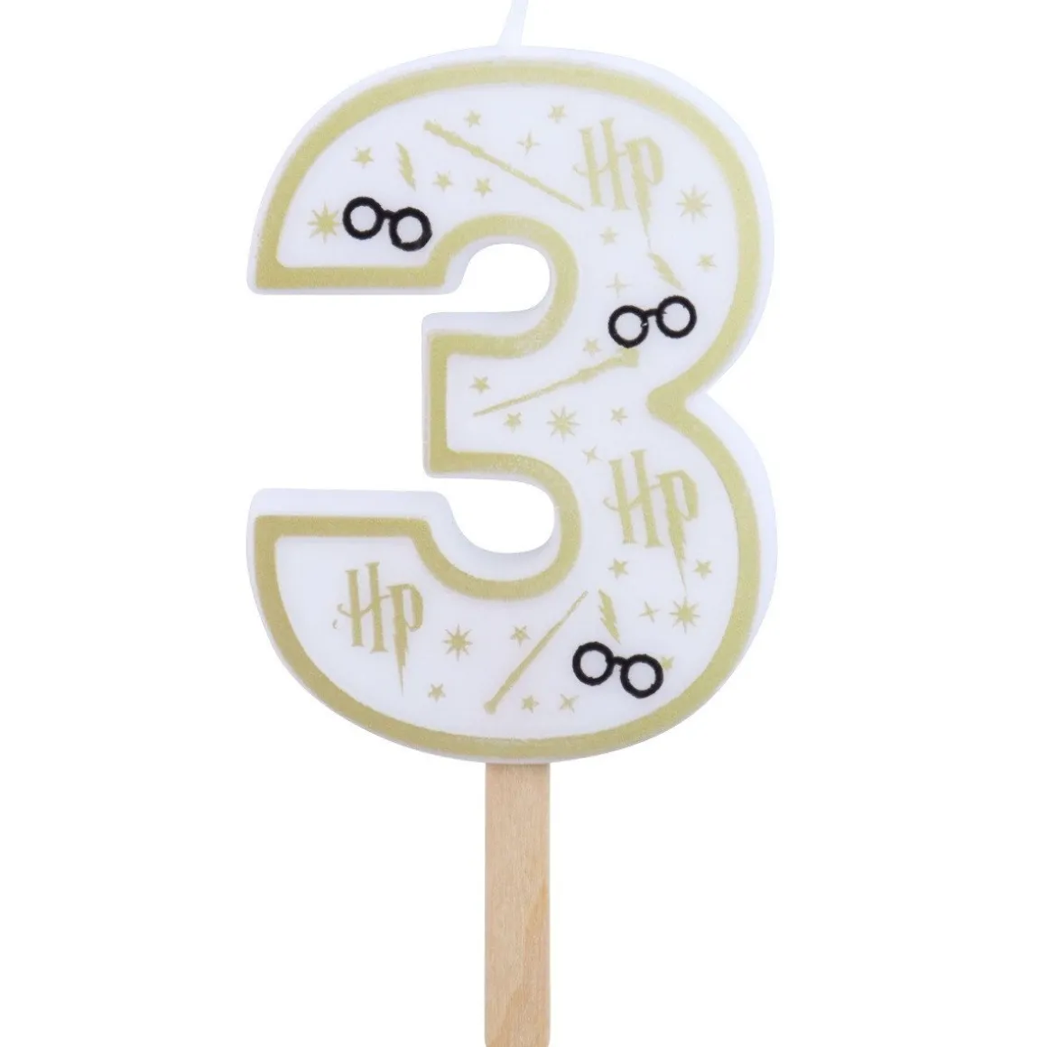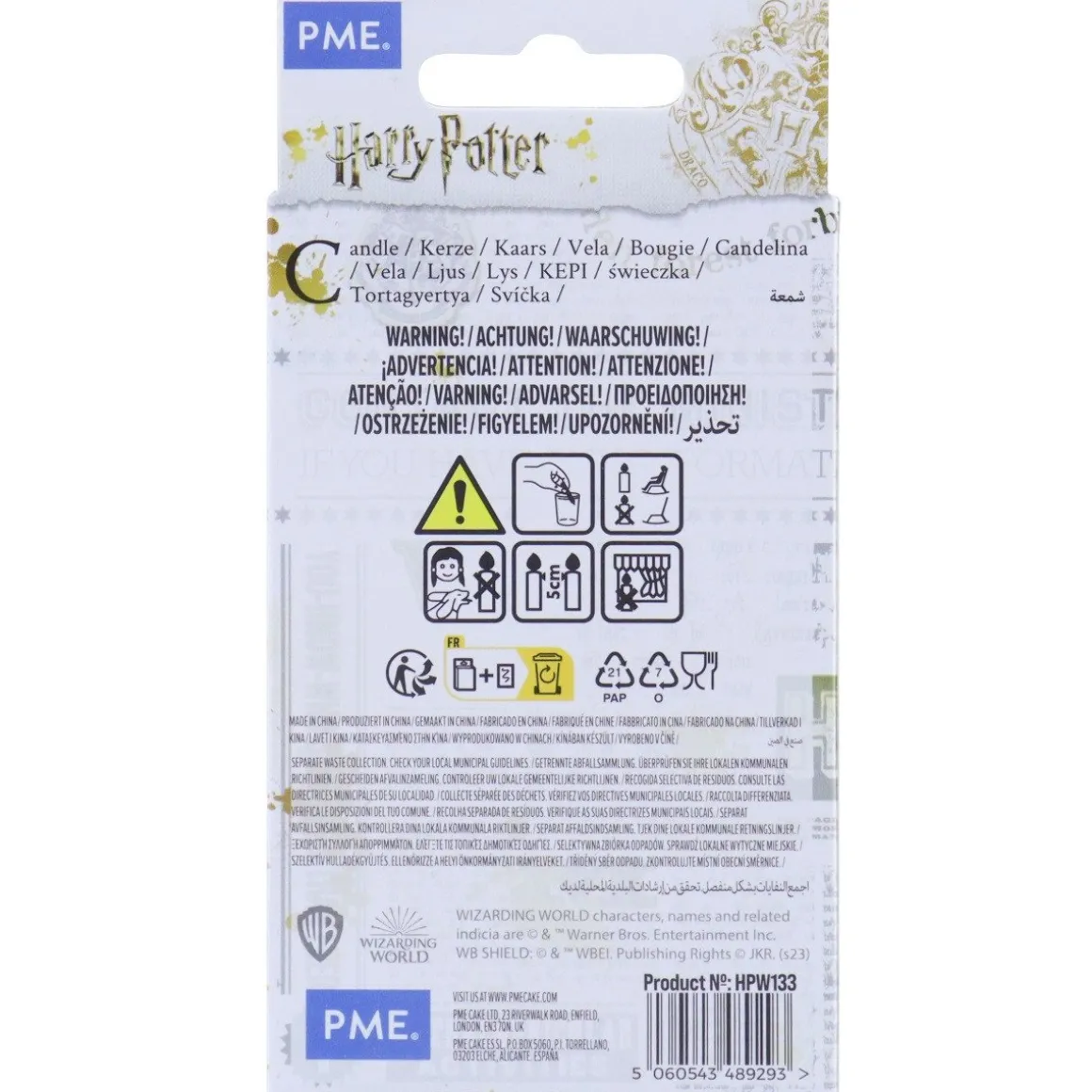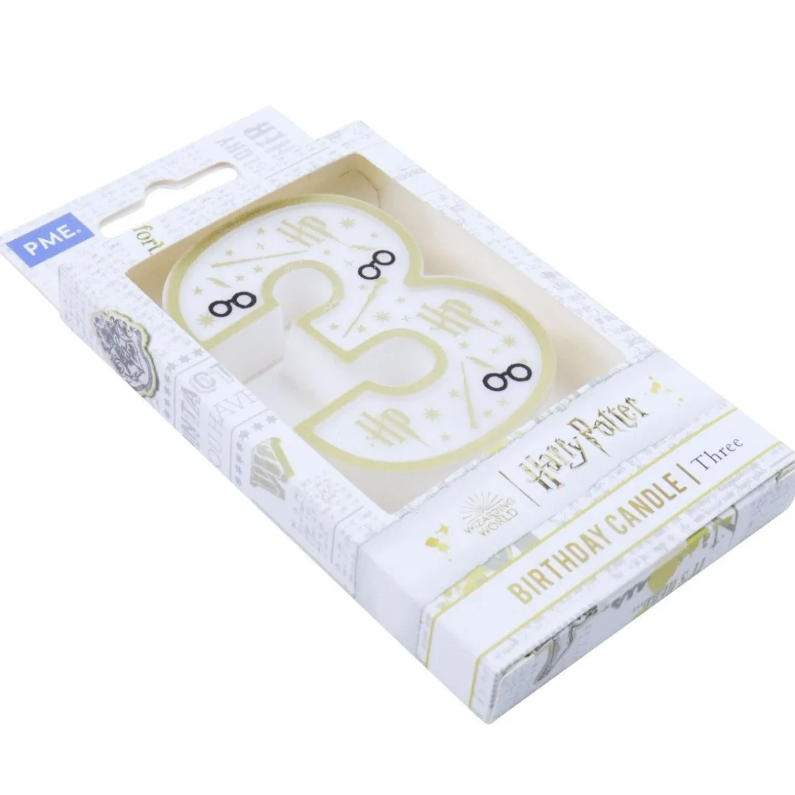 Het PME Harry Potter Taartkaarsje 3 is een nummerkaars met een Harry Potter thema. De kaars heeft een breedte van 5 cm en een lengte van 7 centimeter en daaronder zit een houten prikker. De ondergrond van het kaarsje is wit van kleur met daarop Harry Potter kenmerken. Natuurlijk kan de bekende bril van Harry Potter niet ontbreken. Er staan ook toverstafjes en Harry Potter logo’s op de kaars.