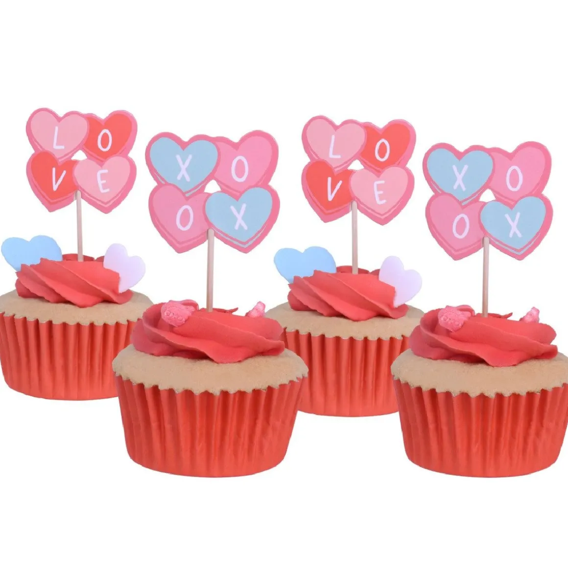 Deze PME Taartprikkers Snoephartjes 24st hebben in de verpakking 2 verschillende ontwerpen. Alle prikkers hebben een papieren topper met 4 hartjes; 1 ontwerp heeft de tekst ‘XOXO’ en het andere ontwerp heeft de tekst ‘Love’. Daarnaast hebben de toppers verschillende kleursamenstellingen.