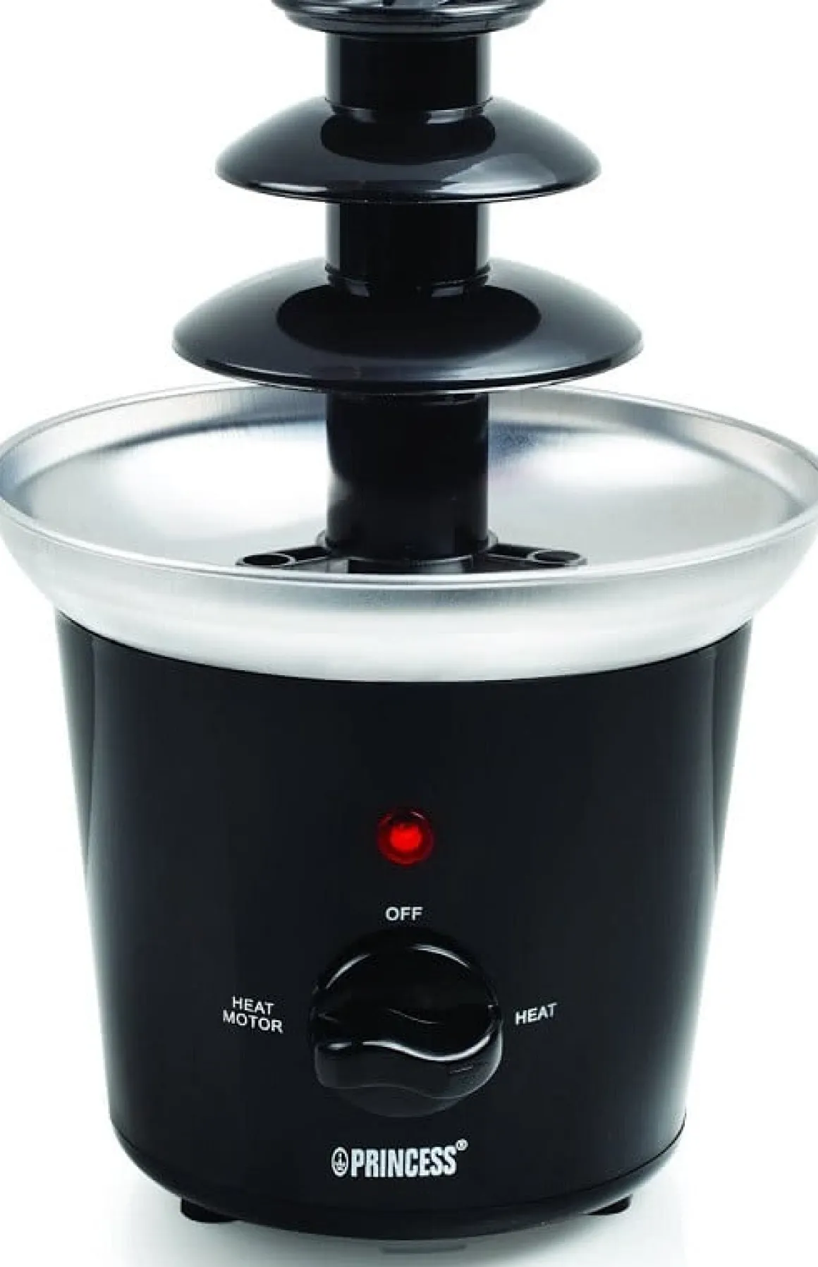 Leuke chocoladefontein van het merk Princess. Hiermee kun je marshmallows, snoep, fruit, koekjes, etc. in een handomdraai voorzien van een heerlijk chocoladelaagje. De fontein pompt en verwarmt de chocolade omhoog. De verwarming en pomp zijn apart schakelbaar.