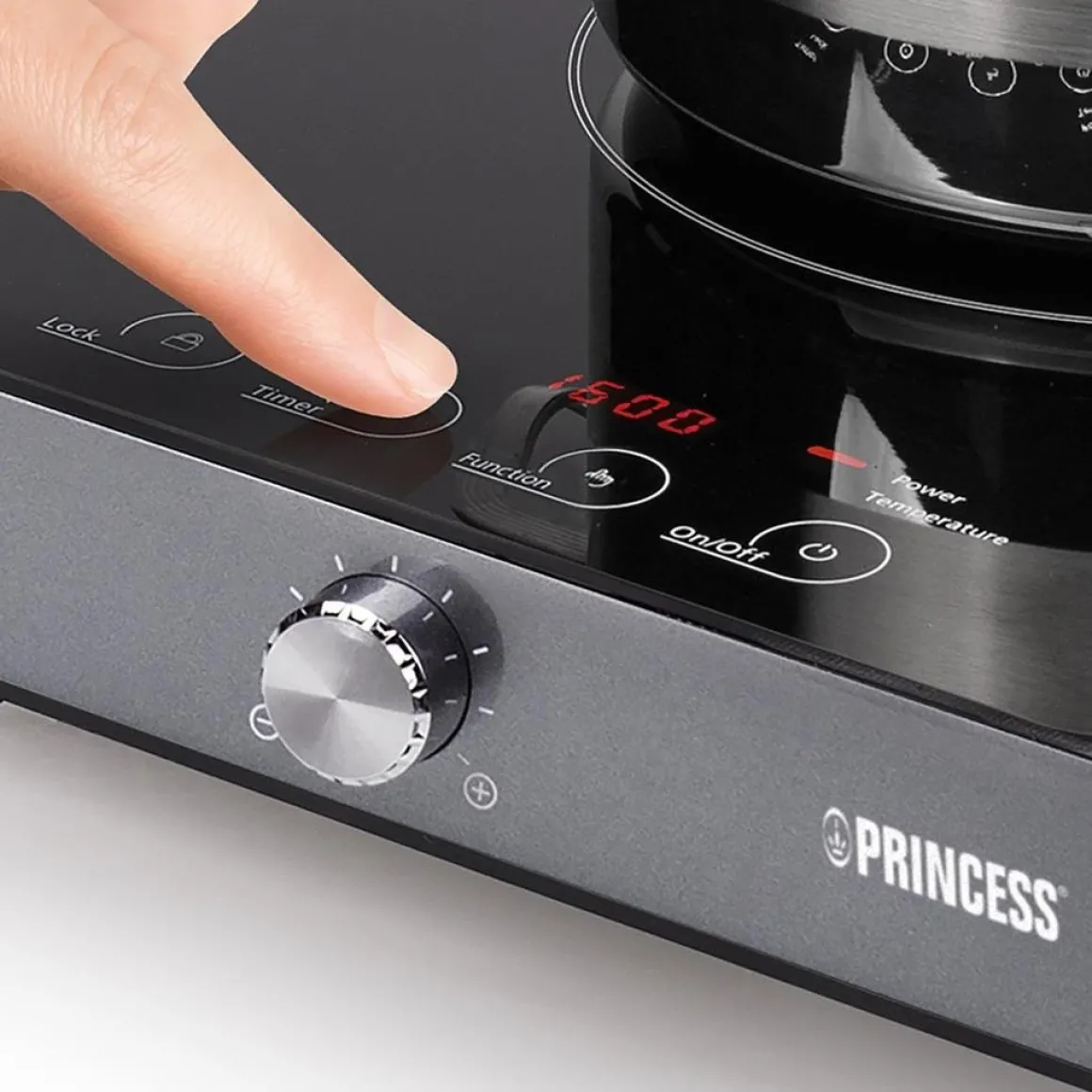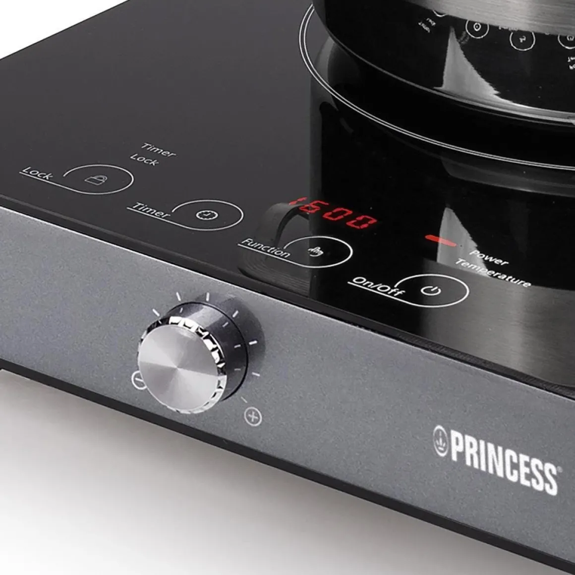 Vrijstaande inductie kookplaat van het merk Princess. Deze kookplaat heeft een mooi glanzend zwart design en beschikt over een eenvoudig te bedienen touch LED-display. De temperatuur is instelbaar van 60 tot 240C graden. De hoogste wattage is 1800 Watt, de kookplaat zal dan zeer snel opwarmen. Daarnaast zit er op deze kookplaat ook een timer(max 180 minuten), handig voor gerechten die een tijdje opgewarmd moeten worden. De kookplaat zal dan een constante temperatuur behouden. Aan veiligheid is natuurlijk ook gedacht, de plaat schakelt namelijk automatisch uit wanneer de pan eraf gehaald wordt. En het beschikt over een oververhittings-beveiliging.