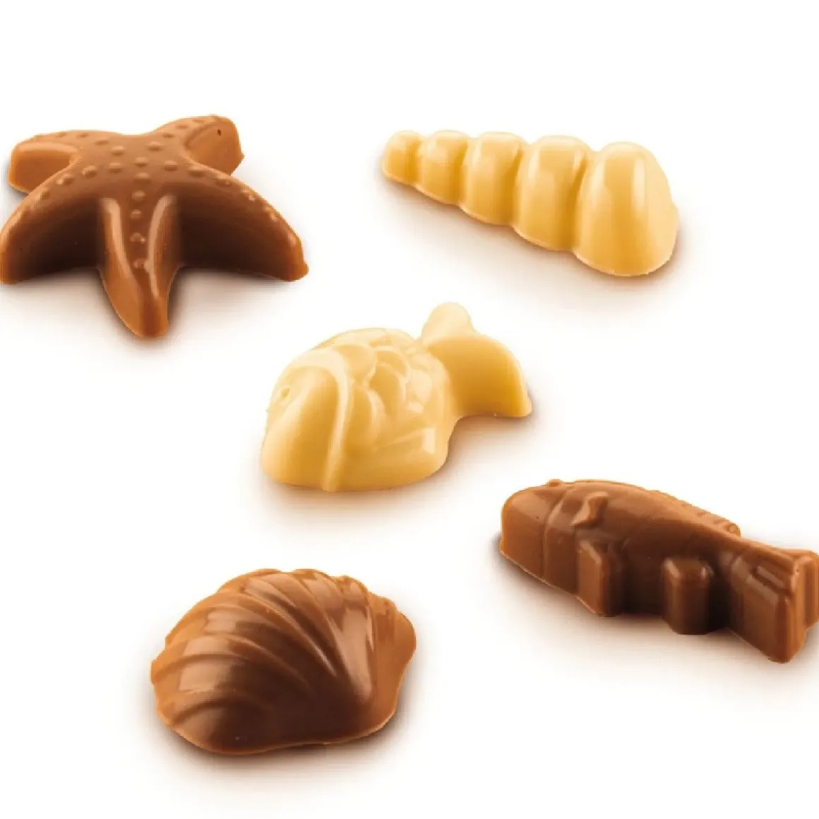 Met de Silikomart Siliconen Bonbonvorm Zeevruchten (12x) Ø3,5×1,6cm maak je chocolaatjes in de vorm van zeevruchten. De siliconen bonbonvorm bevat 12 holtes in onder andere een zeester, vis en schelp vorm.