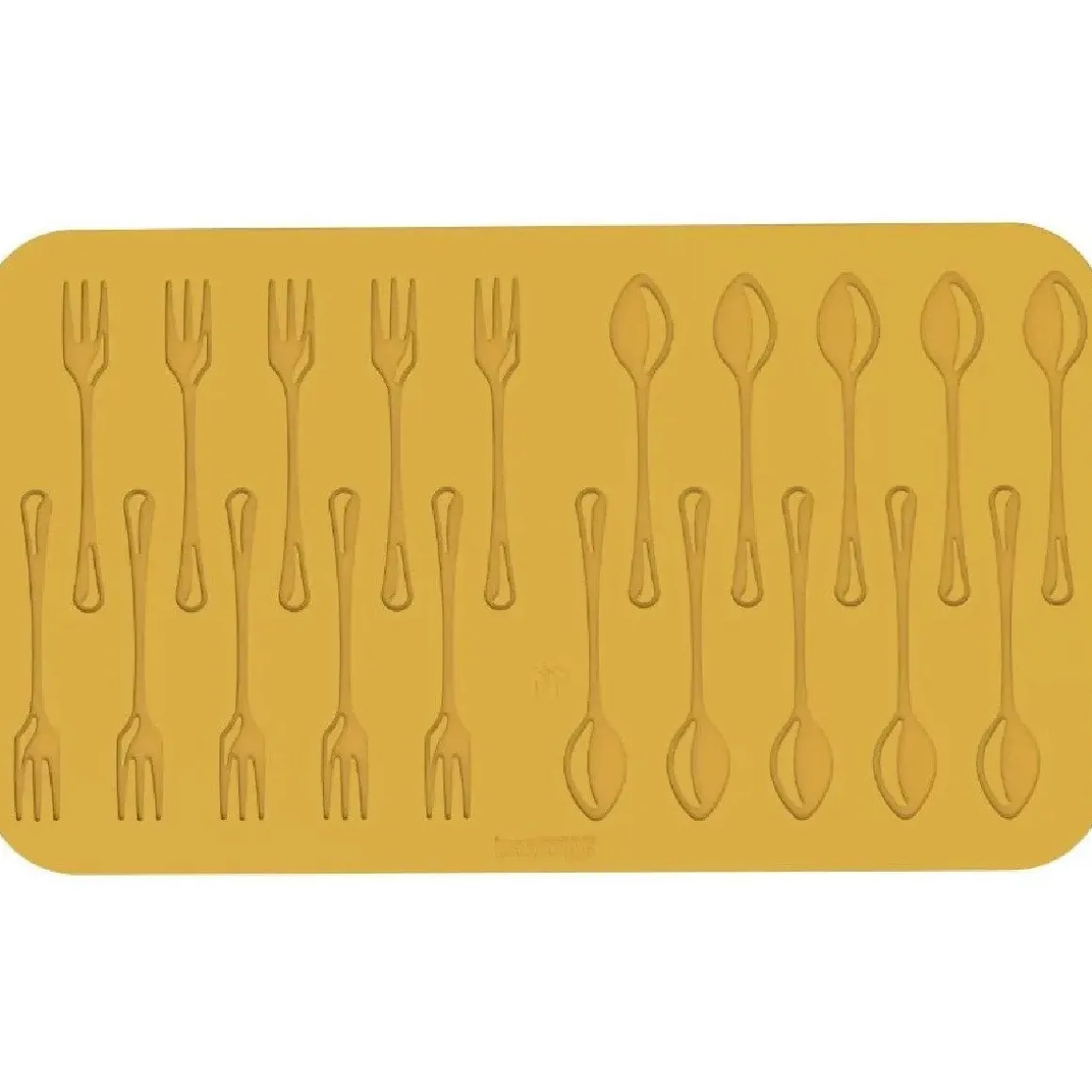 De Silikomart Siliconen Mat Coperto (20) is een siliconen mat met 20 gedetailleerde holtes in de vorm van lepels en vorken. Elke vorm is ongeveer 14 cm lang en ideaal voor het maken van eetbare decoraties, zoals fijne koekjes van tuilebeslag of chocoladevormen.