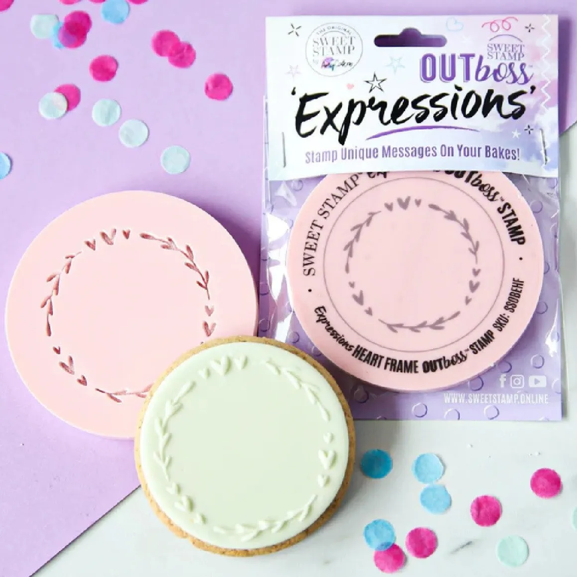 Met de Sweet Stamp Outboss Heart Frame wordt het heel erg gemakkelijk om mooie 3D-opdrukken te maken up sugar paste, fondant, gumpaste en modelleer chocolade. Een OUTBoss™ is het tegenovergestelde van een Sweet Stamp element. Waar je met een element cijfers, letters en symbolen in bijvoorbeeld fondant drukt, lijkt het met een OUTBoss™ juist alsof cijfers, letters en symbolen op het fondant zijn geplakt. Echter komt bij het gebruiken van een 3D-opdruk met een Outboss™ geen eetbare lijm kijken. De Outboss™ heeft het perfecte formaat om opdrukken te maken die precies op middelgrote koekjes en cupcakes passen. Je kunt eventueel apart een PickUpPad bestellen om het voor jezelf nog makkelijker te maken om dit product te gebruiken, deze is niet bij dit product inbegrepen.