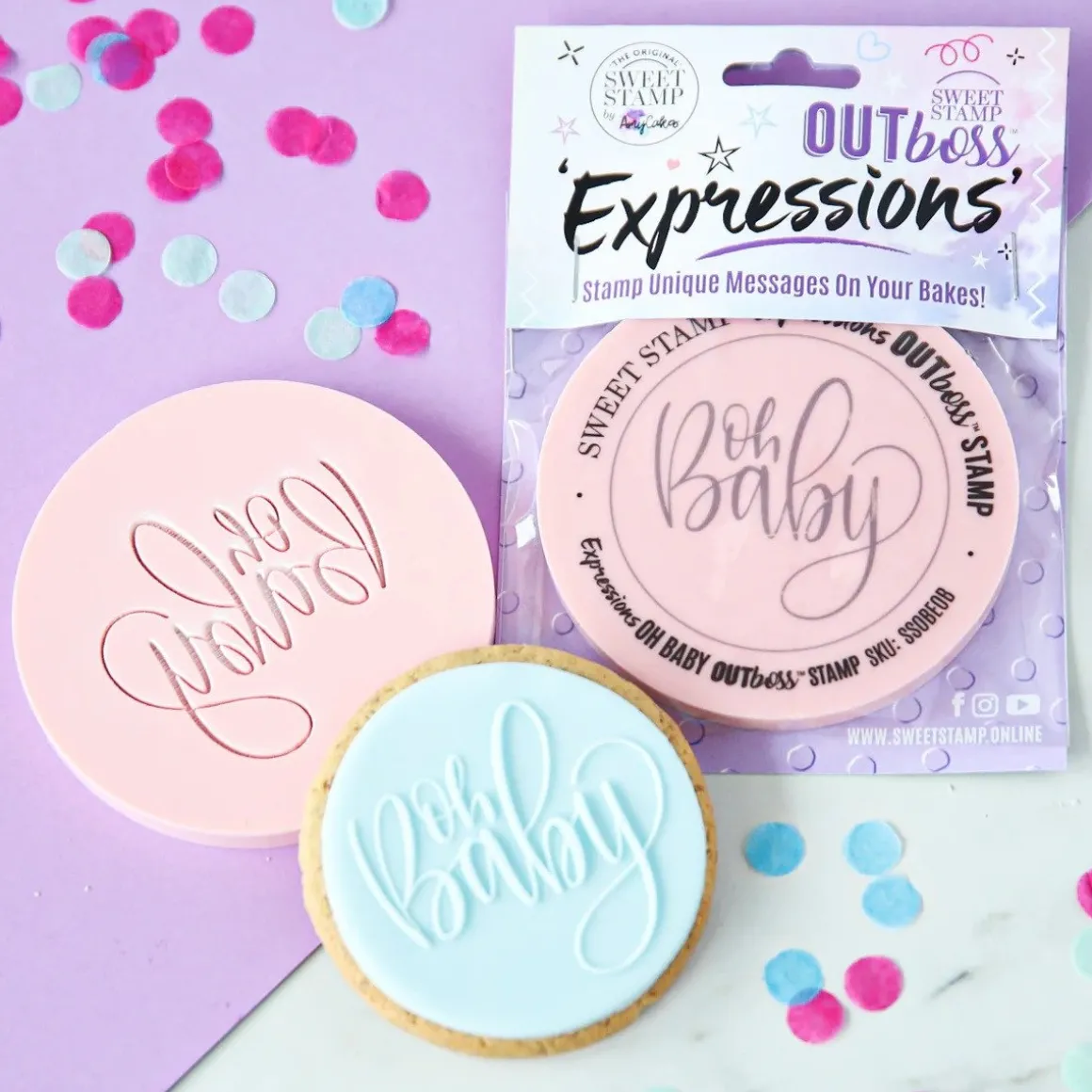 Met de Sweet Stamp Outboss Oh Baby wordt het vrij eenvoudig om mooie 3D-opdrukken te maken op onder andere sugar paste, fondant, gumpaste en modelleer chocolade. Het is bijvoorbeeld heel erg leuk om met dit artikel cupcakes en koekjes te versieren als kraamhapje wanneer een kindje is geboren of juist als cadeautje voor de kersverse ouders. Je kunt ermee zelfs decoraties voor lekkernijen maken voor bijvoorbeeld babyshowers en gender reveal party’s. Een OUTBoss™ is het tegenovergestelde van een Sweet Stamp element. Waar je met een element cijfers, letters en symbolen in bijvoorbeeld fondant drukt, lijkt het met een OUTBoss™ juist alsof cijfers, letters en symbolen op het fondant zijn geplakt. Echter komt bij het gebruiken van een 3D-opdruk met een Outboss™ geen eetbare lijm kijken. De Outboss™ heeft het perfecte formaat om opdrukken te maken die precies op middelgrote koekjes en cupcakes passen.