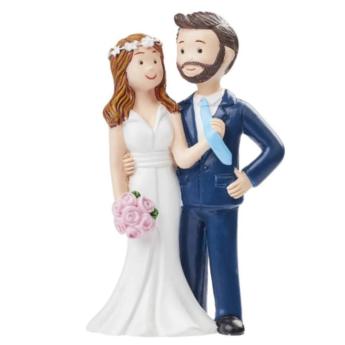 De Taarttopper Bruidspaar Stropdas Polystone 8cm geeft een geweldige finishing touch aan jouw bruidstaart. Het beeldje bestaat uit een bruid en een bruidegom. De bruid heeft een haarband in het haar, een roze boeket in de hand en in de andere hand houdt ze de blauwe stropdas van de bruidegom vast. De taarttopper gemaakt van polystone en heeft het een lengte van ongeveer 8 centimeter.