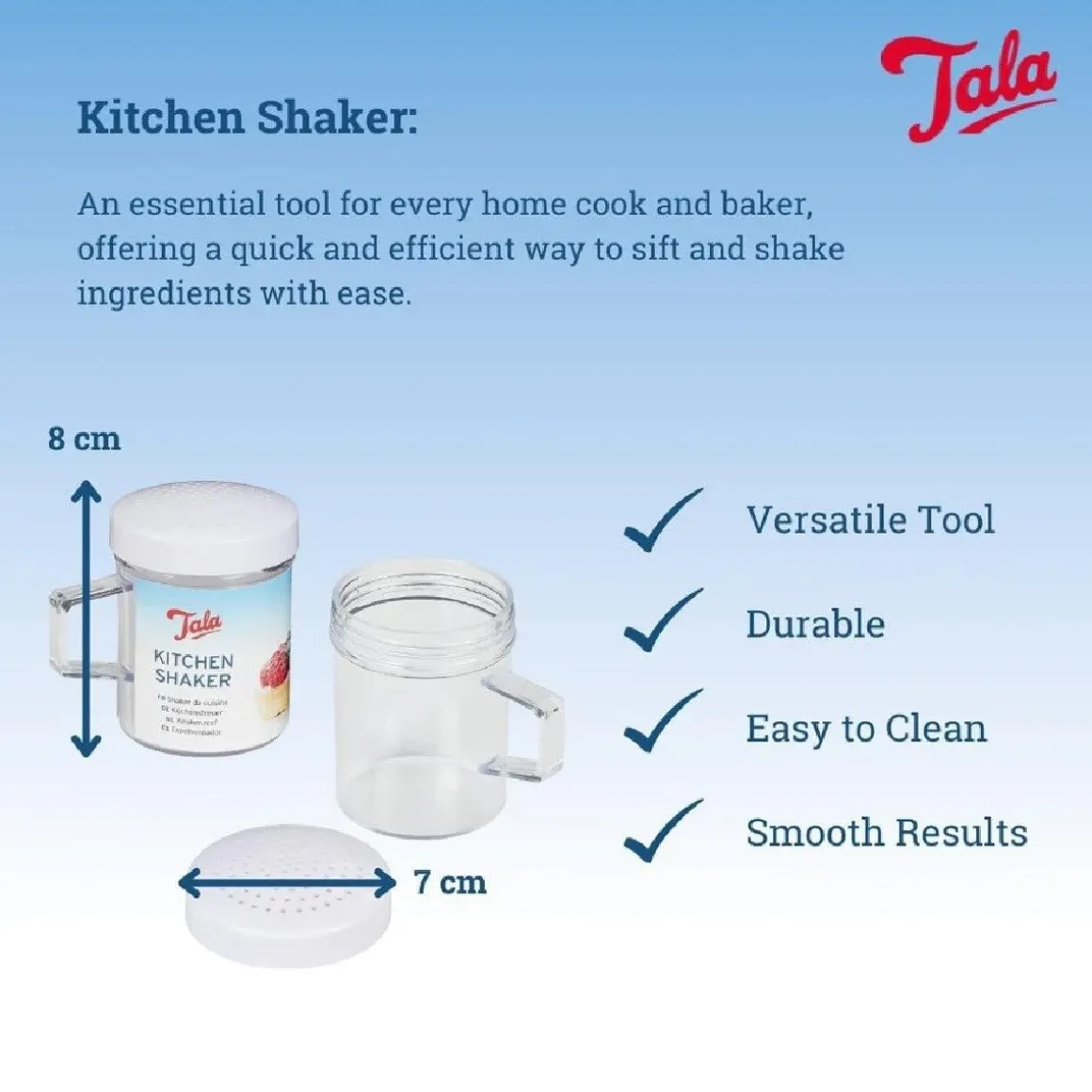 De Tala Keukenzeef Ø7×8 cm is een handig hulpmiddel voor iedereen die graag bakt. Deze kunststof shaker is ideaal voor het gelijkmatig strooien van poedersuiker, cacao, bloem of maïzena.