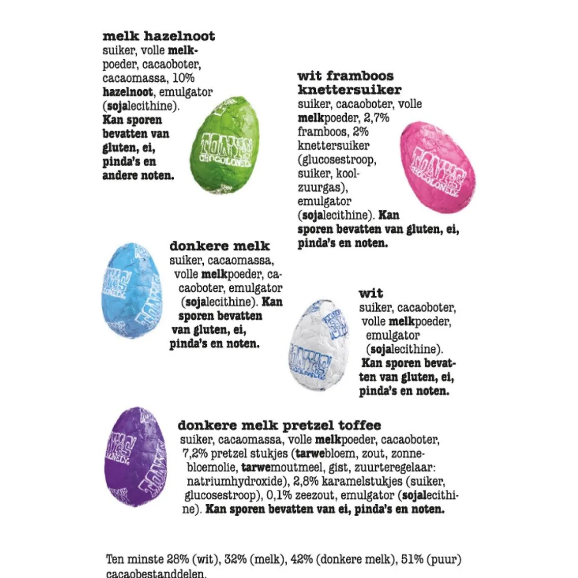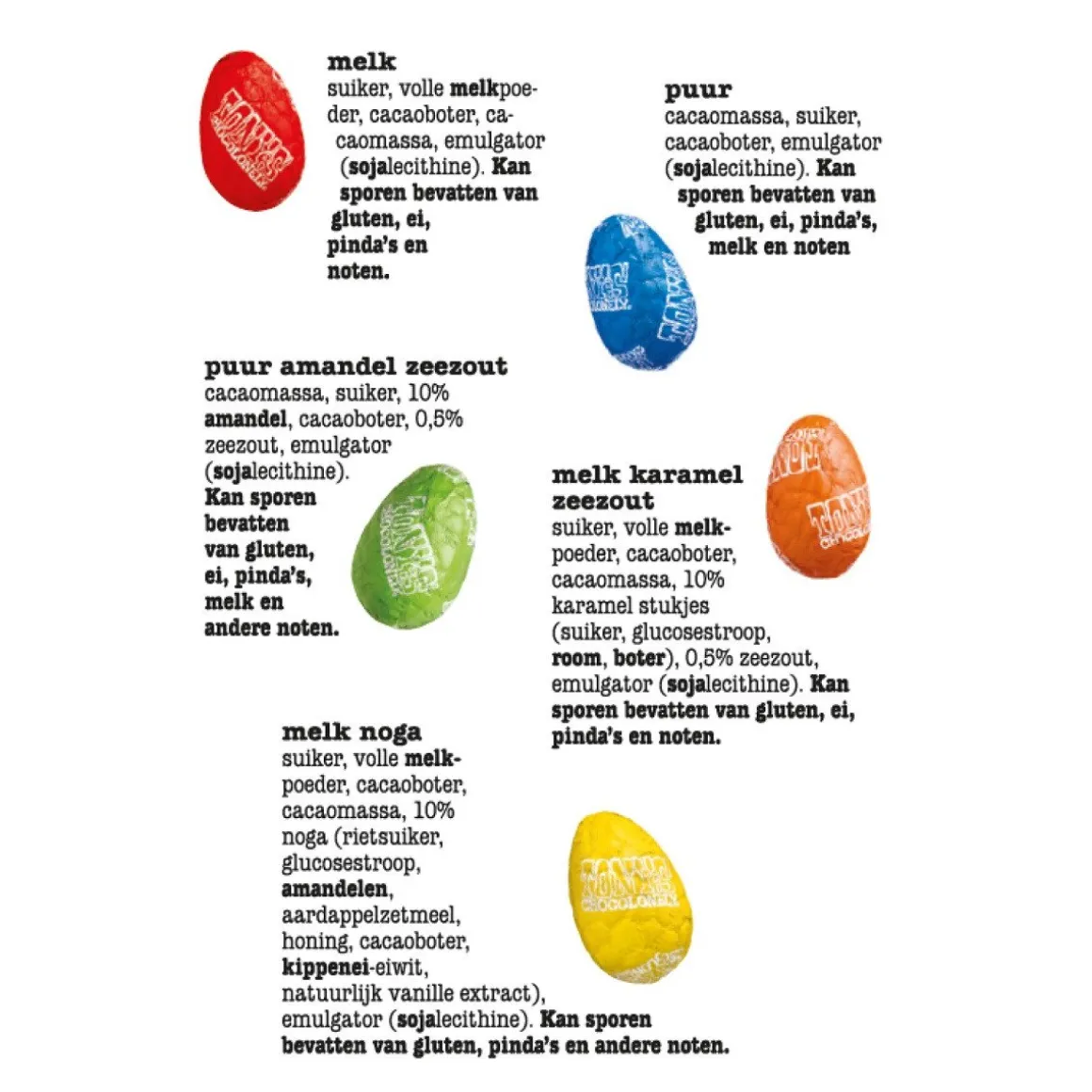 - 10 smaken: o.a. melk, wit puur met stukjes hazelnoot, noga, karamel, zeezout en amandel.
