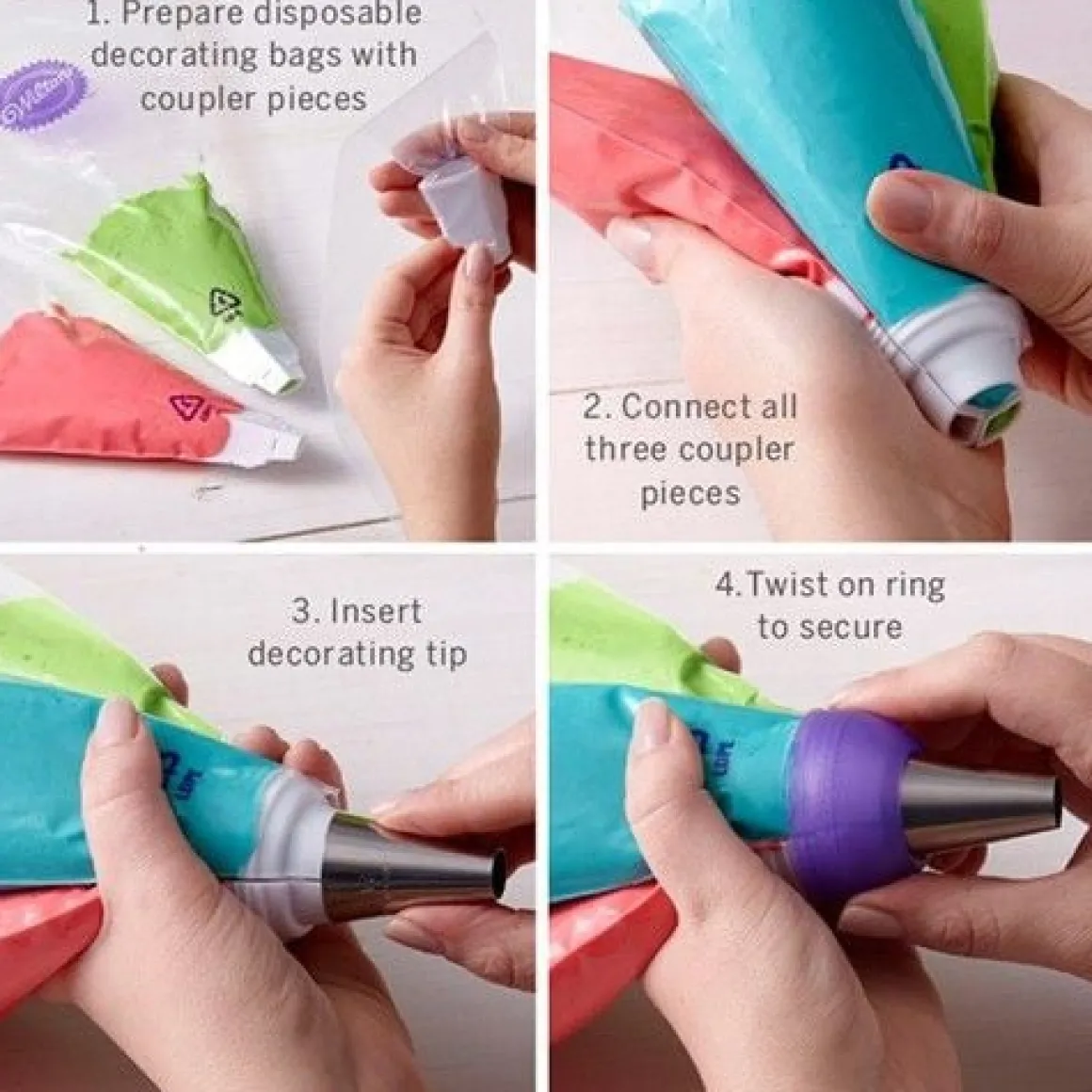 De adapter maakt het versieren van allerlei (zoete) lekkernijen zeer eenvoudig. Daarnaast kun je de spuitmondjes heel makkelijk wisselen zodat je ook andere technieken toe kan passen! Deze adapter bevat drie koppelstukken die precies in elkaar passen. Deze worden in de spuitzakken geplaatst. De ring zorgt ervoor dat het spuitmondje op zijn plek blijft zitten tijdens het decoreren.