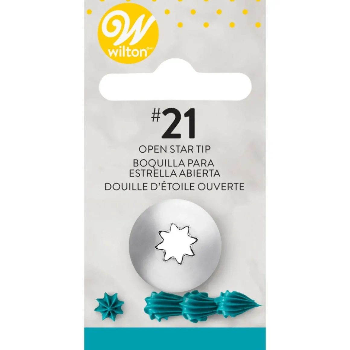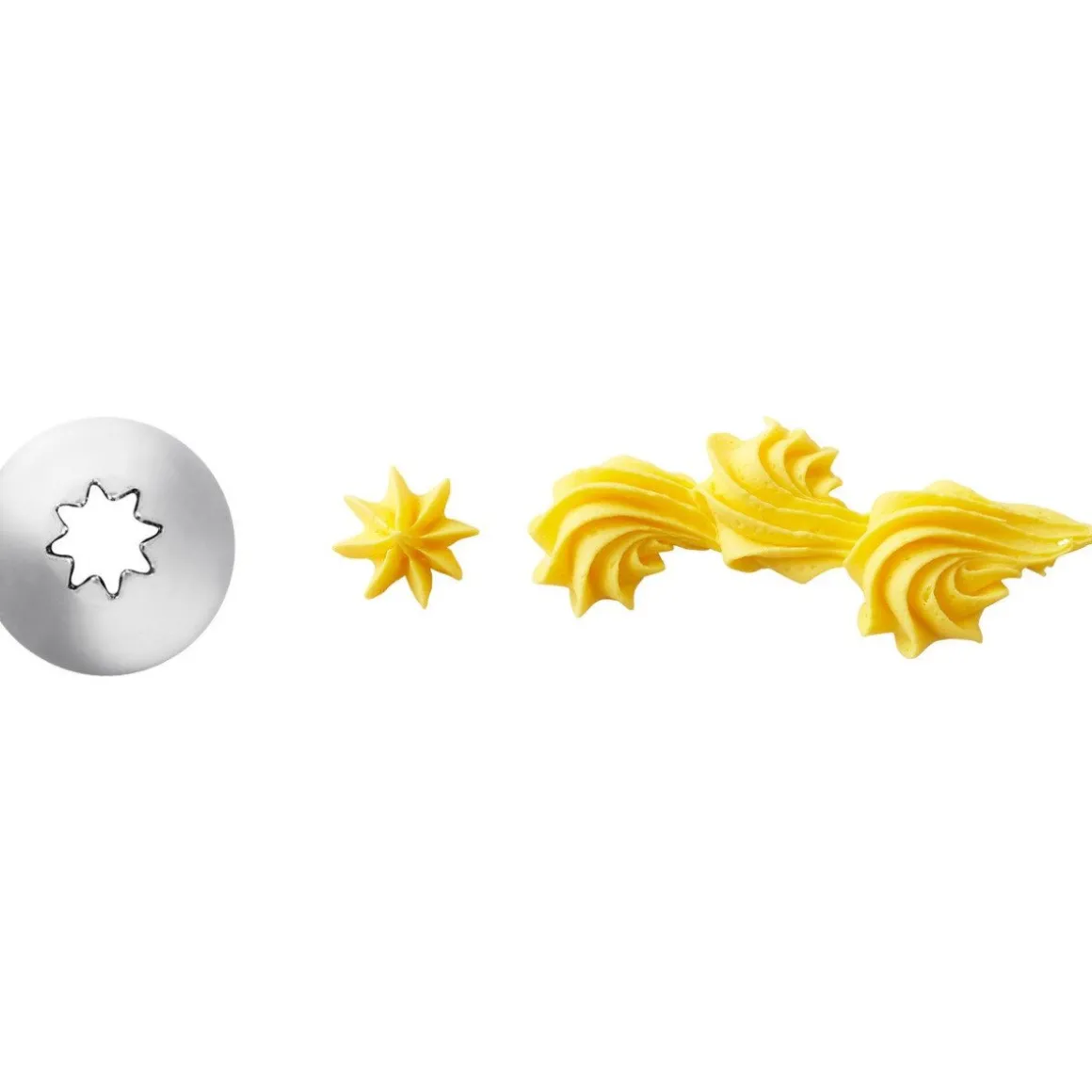 Het Wilton Spuitmondje #021 heeft de vorm van een open ster, is gekarteld en heeft 8 tanden. Ideaal om verschillende technieken toe te passen. Uiteraard ideaal voor ster technieken, maar ook voor perfect voor het maken van bloemen, schelpen en wervelingen.
