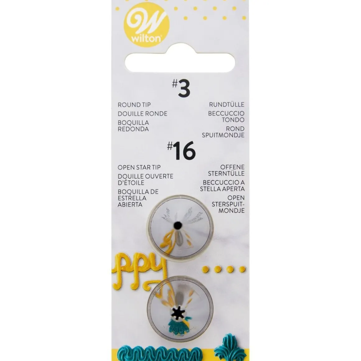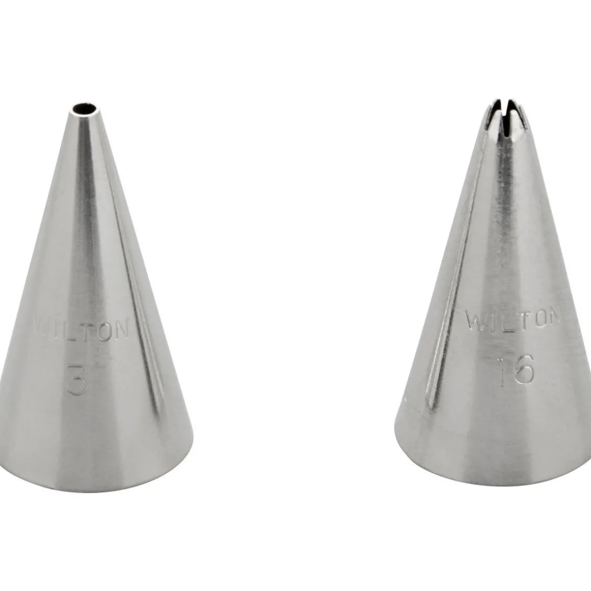 Set van 2 metalen spuitmondjes van het merk Wilton te gebruiken bij het maken van dunne lijntjes, puntjes, balletjes, pareltjes en fijn kant en voor het maken van sterretjes, dropflowers en gekartelde randjes. De set bestaat uit de spuitmondjes: #003 & #016.