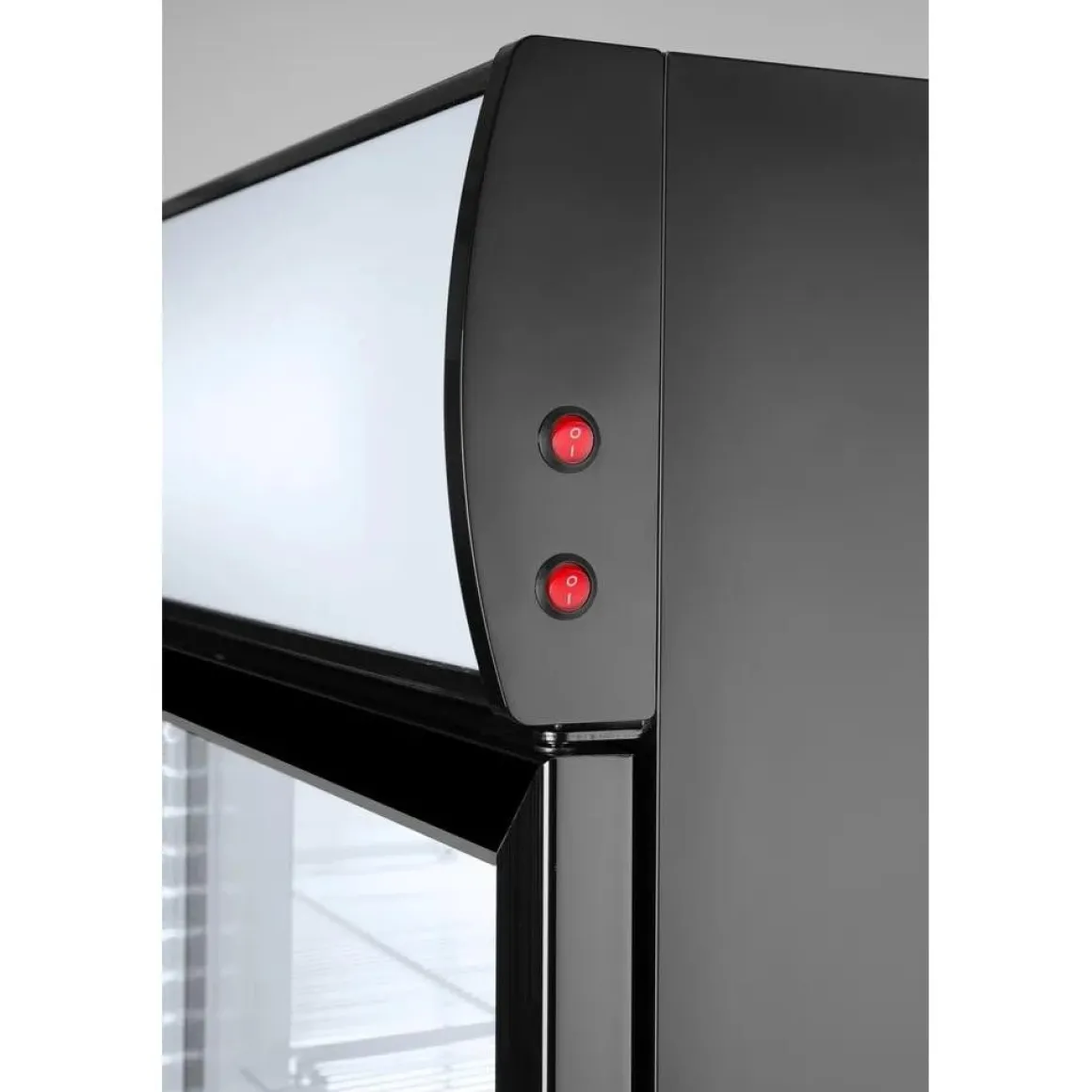Gepoedercoate zwarte stalen behuizing. Deze uitvoering is vervaardigd uit wit gelakt aluminium. Deze uitvoering is vervaardigd uit kunststof. Voorpaneel van gehard glas. Kan met een sleutel afgesloten worden. Statische koeling met ventilator. Automatisch ontdooien. De koelcompressor bevindt zich onder de kamer. Temperatuurbereik: 2-10 °C. Kamer voorzien van LED-verlichting. Elektromechanische thermostaat bediend met een draaiknop. 4 zwenkwielen, inclusief 2 met remmen. Klimaatklasse: 4. Energieklasse: D.