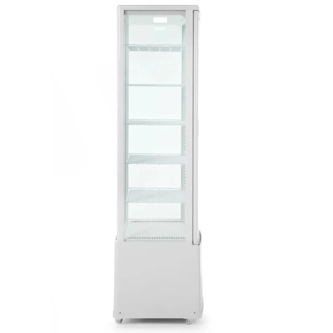 Deze uitvoering is vervaardigd uit ABS en PVC, voorzien van dubbel glas. Koelunit behuizing van ABS. Geforceerde luchtkoeling met automatische ontdooiing, compressor geplaatst onder de koelruimte. Luchtkanaal buiten het glas blaast lucht over het glas om condens te verwijderen en te voorkomen. Duurzame planken met PVC-coating, in hoogte verstelbaar. Met heldere LED-verlichting in het plafond. Digitale temperatuurregelaar en display. Klimaatklasse: 4.
