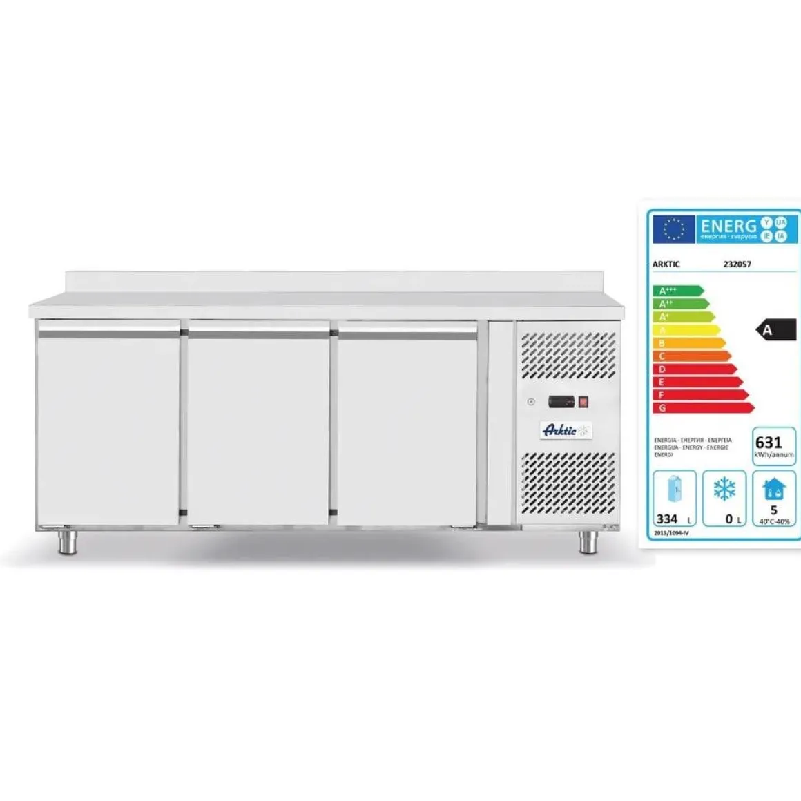 Ruime koelwerkbank met 3 schappen en een bodem waar je producten kan stallen. Het grote blad biedt veel werkruimte en heeft een spatrand.
