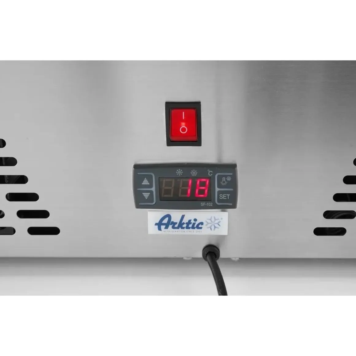 Behuizing van hoogwaardig roestvast staal, voorzien van gebogen glazen kap met gemakkelijk te openen systeem. Geforceerde luchtkoeling met automatische ontdooiing, compressor naast de koelruimte geplaatst. Uitermate geschikt om te gebruiken bij 8x GN 1/6 GN-containers of 4x GN 1/3 containers (max. Hoogte 100 mm), niet inbegrepen. Met 4 verstelbare roestvast stalen poten. Digitale temperatuurregelaar en display. Koelmiddel: R600a. Klimaatklasse: 4. Energielabel: C.